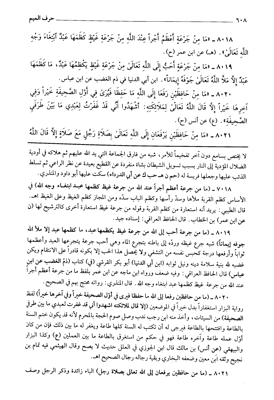 8019 - (ما من جرعة أحب إلى الله من جرعة غيظ يكظمها عبد ، ما كظمها عبد إلا ملأ الله جوفه إيمانا) شبه جرع غيظه ورده إلى باطنه بتجرع الماء وهي أحب جرعة يتجرعها العبد وأعظمها ثوابا وأرفعها درجة كحبس نفسه من التشفي ولا يحصل هذا الحب إلا بكونه قادرا على الانتقام ويكن غضبه لله بنية سلامة دينه ونيل ثوابه.