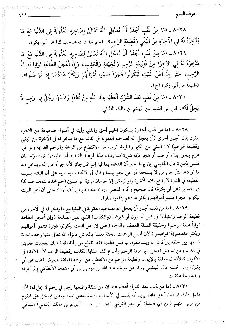 8028 - (ما من ذنب أجدر) بسكون الجيم أحق والذي رأيته في أصول صحيحة من الأدب المفرد بدل أجدر أحرى (أن يعجل الله لصاحبه العقوبة في الدنيا مع ما يدخر له في الآخرة من البغي وقطيعة الرحم) لأن البغي من الكبر وقطيعة الرحم من الاقتطاع من الرحمة والرحم القرابة ولو غير محرم بنحو إيذاء أو صد أن هجر فإنه كبير كما يفيده هذا الوعيد الشديد أما قطيعتها بترك الإحسان فليس بكبير قال الحليمي : بين بهذا الخبر أن الدعاء بما فيه إثم غير جائز لأنه جرأة على الله ويدخل فيه ما لو دعا بشر على من لا يستحقه أو على نحو بهيمة وقال في الإنحاف : فيه تنبيه على أن البلاء بسبب القطيعة في الدنيا لا يدفع بلاء الآخرة ولو لم يكن إلا حرمان مرتبة الواصلين.
