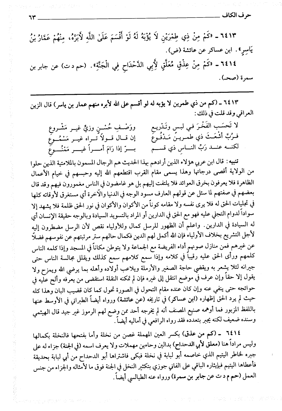 6413 - (كم من ذي طمرين لا يؤبه له لو أقسم على الله لأبره منهم عمار بن ياسر) قال الزين العراقي : وقد قلت في ذلك : لا تحسب الفخر في لبس وتدريع * ووصف حسن وزي غير مشروع