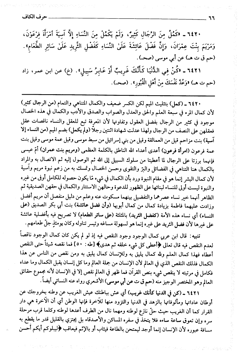 6420 - (كمل) بتثليث الميم لكن الكسر ضعيف والكمال المتناهي والتمام (من الرجال كثير) لأن كمال المرء في سبعة العلم والحق والعدل والصواب الصدق والأدب والكمال في هذه الخصال موجود في كثير من الرجال بفضل العقول وتفاوتها لأن المعرفة تبع للعقل والنساء ناقصات عقل فعقلهن على النصف من الرجال ولهذا عدلت شهادة اثنتين رجلا (ولم يكمل) بضم الميم (من النساء إلا آسية) بنت مزاحم قيل من العمالقة وقيل من بني إسرائيل من سبط موسى وقيل عمة موسى وقيل بنت عمة فرعون (امرأة فرعون) أعدى أعداء الله الناطق بالكلمة العظمى (ومريم بنت عمران) أم عيسى فإنهما برزتا على الرجال لما أعطيتا من سلوك السبيل إلى الله ثم الوصول إليه ثم الاتصال به والمراد بالكمال هنا التناهي في الفضائل والبر والتقوى وحسن الخصال وتمسك به من زعم نبوة مريم وآسية لأن كمال البشر إنما هو في مقام النبوة وارد بأن الكمال في شئ ما يكون حصوله للكامل أوفى من غيره والنبوة ليست أولى للنساء لبنائها على الظهور للدعوة وحالهن الاستنكار والكمال في حقهن الصديقية ثم الظاهر أنهما خير نساء عصرهما والتفضيل بينهما مسكوت عنه وعلم من دليل منفصل أن مريم أفضل وزادت عليهما فاطمة بزيادة كمال من كمال أبويها (وأن فضل عائشة) بنت أبي بكر الصديق (على النساء) أي نساء هذه الأمة (كفضل الثريد) بالمثلثة (على سائر الطعام) لا تصريح فيه بأفضلية عائشة على غيرها لأن فضل الثريد على غيره إنما هو لسهولة مساغه وتيسر تناوله وكان يومئذ جل طعامهم.
