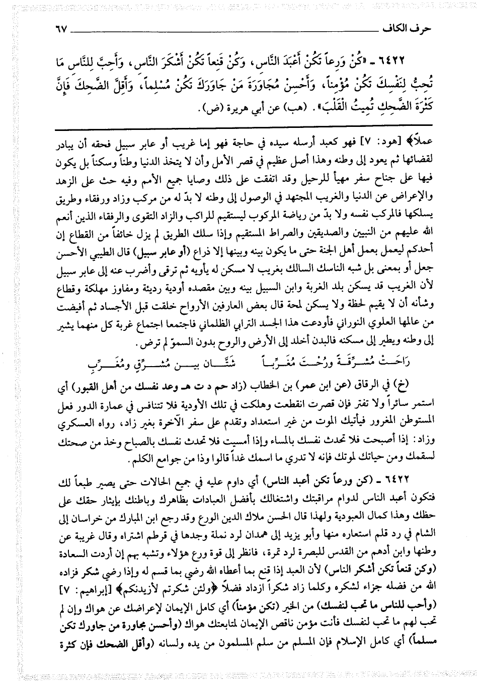 6422 - (كن ورعا تكن أعبد الناس) أي داوم عليه في جميع الحالات حتى يصير طبعا لك فتكون أعبد الناس لدوام مراقبتك واشتغالك بأفضل العبادات بظاهرك وباطنك بإيثار حقك على حظك وهذا كمال العبودية ولهذا قال الحسن : ملاك الدين الورع وقد رجع ابن المبارك من خراسان إلى الشام في رد قلم استعاره منها وأبو يزيد إلى همدان لرد نملة وجدها في قرطم اشتراه وقال : غريبة عن وطنها وابن أدهم من القدس للبصرة لرد تمرة ، فانظر إلى قوة ورع هؤلاء وتشبه بهم إن أردت السعادة (وكن قنعا تكن أشكر الناس) لأن العبد إذا قنع بما أعطاه الله رضي بما قسم له وإذا رضي شكر فزاده الله من فضله جزاء لشكره وكلما زاد شكرا ازداد فضلا * (لئن شكرتم لأزيدنكم) * (وأحب للناس ما تحب لنفسك) من الخير (تكن مؤمنا) أي كامل الإيمان لإعراضك عن هواك وإن لم تحب لهم ما تحب لنفسك فأنت مؤمنا ناقص الإيمان لمتابعتك هواك (وأحسن مجاورة من جاورك تكن مسلما) أي كامل الإسلام فإن المسلم من سلم المسلمون من يده ولسانه (وأقل الضحك فإن كثرة