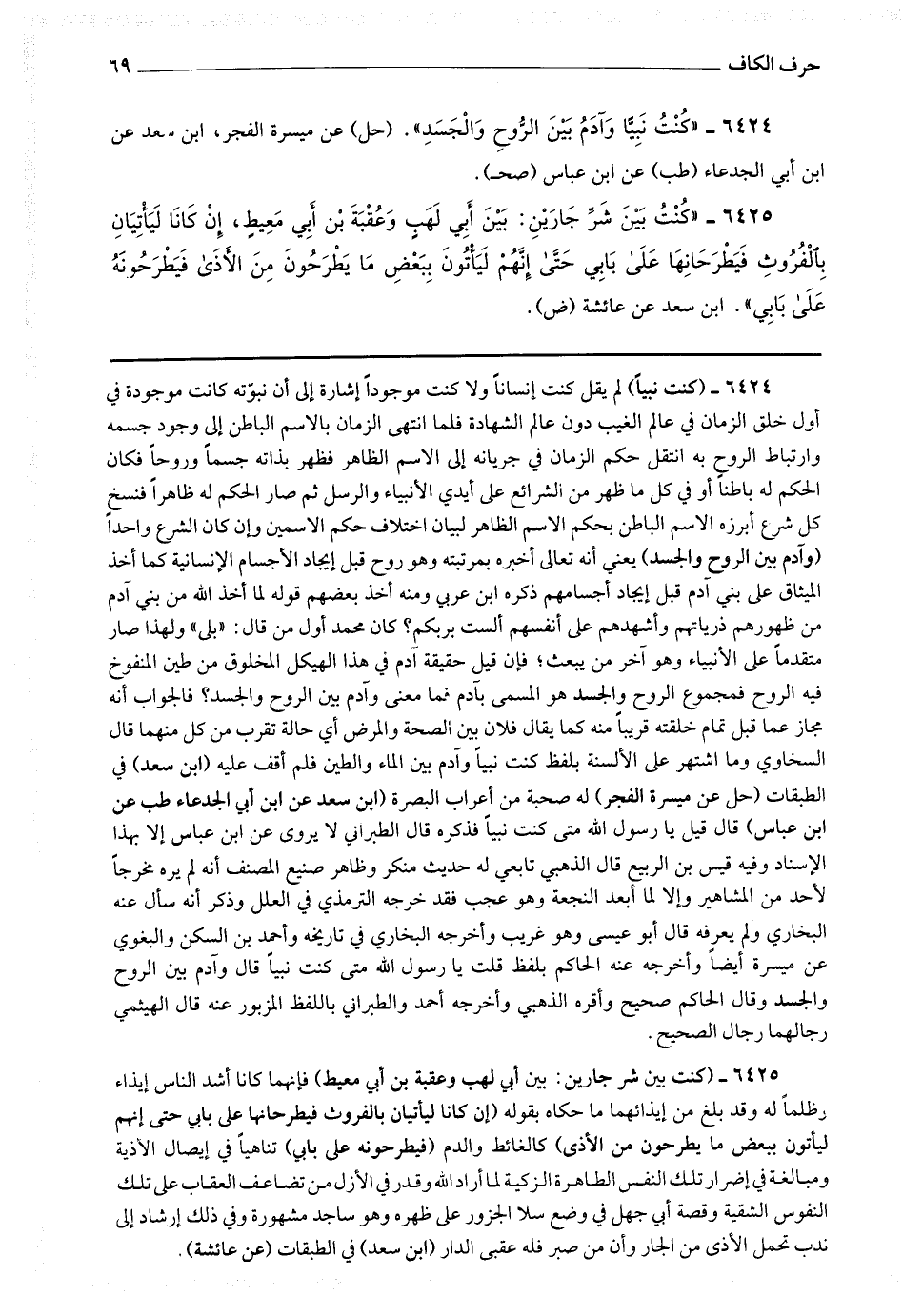 6424 - (كنت نبيا) لم يقل كنت إنسانا ولا كنت موجودا إشارة إلى أن نبوته كانت موجودة في أول خلق الزمان في عالم الغيب دون عالم الشهادة فلما انتهى الزمان بالاسم الباطن إلى وجود جسمه وارتباط الروح به انتقل حكم الزمان في جريانه إلى الاسم الظاهر فظهر بذاته جسما وروحا فكان الحكم له باطنا أوفى كل ما ظهر من الشرائع على أيدي الأنبياء والرسل ثم صار الحكم له ظاهرا فنسخ كل شرع أبرزه الاسم الباطن بحكم الاسم الظاهر لبيان اختلاف حكم الاسمين وإن كان الشرع واحدا (وآدم بين الروح والجسد) يعني أنه تعالى أخبره بمرتبته وهو روح قبل إيجاد الأجسام الإنسانية كما أخذ الميثاق على بني آدم قبل إيجاد أجسامهم ذكره ابن عربي ومنه أخذ بعضهم قوله لما أخذ الله من بني آدم من ظهورهم ذرياتهم وأشهدهم على أنفسهم ألست بربكم كان محمد أول من قال بلى ولهذا صار متقدما على الأنبياء وهو آخر من يبعث ، فإن قيل حقيقة آدم في هذا الهيكل المخلوق من طين المنفوخ فيه الروح فمجموع الروح والجسد هو المسمى بآدم فما معنى وآدم بين الروح والجسد ؟ فالجواب أنه مجاز عما قبل تمام خلقته قريبا منه كما يقال فلان بين الصحة والمرض أي حالة تقرب من كل منهما قال السخاوي : وما اشتهر على الألسنة بلفظ كنت نبيا وآدم بين الماء والطين فلم أقف عليه.