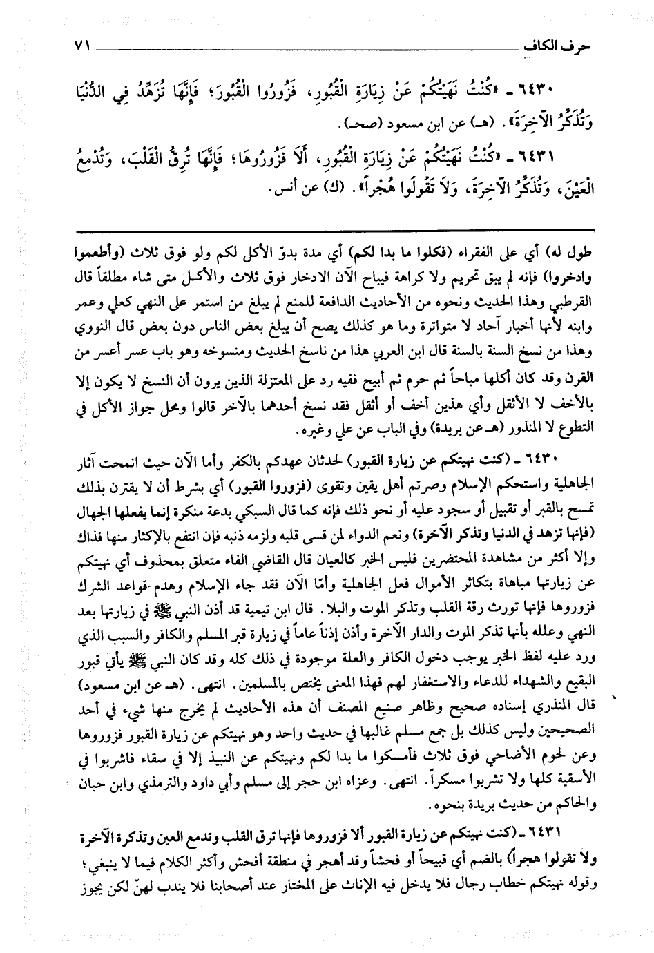 6430 - (كنت نهيتكم عن زيارة القبور) لحدثان عهدكم بالكفر وأما الآن حيث انمحت آثار الجاهلية واستحكم الإسلام وصرتم أهل يقين وتقوى (فزوروا القبور) أي بشرط أن لا يقترن بذلك تمسح بالقبر أو تقبيل أو سجود عليه أو نحو ذلك فإنه كما قال السبكي بدعة منكرة إنما يفعلها الجهال (فإنها تزهد في الدنيا وتذكر الآخرة) ونعم الدواء لمن قسى قلبه ولزمه ذنبه فإن انتفع بالإكثار منها فذاك وإلا أكثر من مشاهدة المحتضرين فليس الخبر كالعيان قال القاضي: الفاء متعلق بمحذوف أي نهيتكم عن زيارتها مباهاة بتكاثر الأموال فعل الجاهلية وأما الآن فقد جاء الإسلام وهدم قواعد الشرك فزوروها فإنها تورث رقة القلب وتذكر المموت والبلى، قال ابن تيمية: قد أذن النبي صلى الله عليه وسلم في زيارتها بعد النهي وعلله بأنها تذكر الموت والدار الآخرة وأذن إذنا عاما في زيارة قبر المسلم والكافر والسبب الذي ورد عليه لفظ الخبر يوجب دخول الكافر والعلة موجودة في ذلك كله وقد كان النبي صلى الله عليه وسلم يأتي قبور البقيع والشهداء للدعاء والاستغفار لهم فهذا المعنى يختص بالمسلمين انتهى.