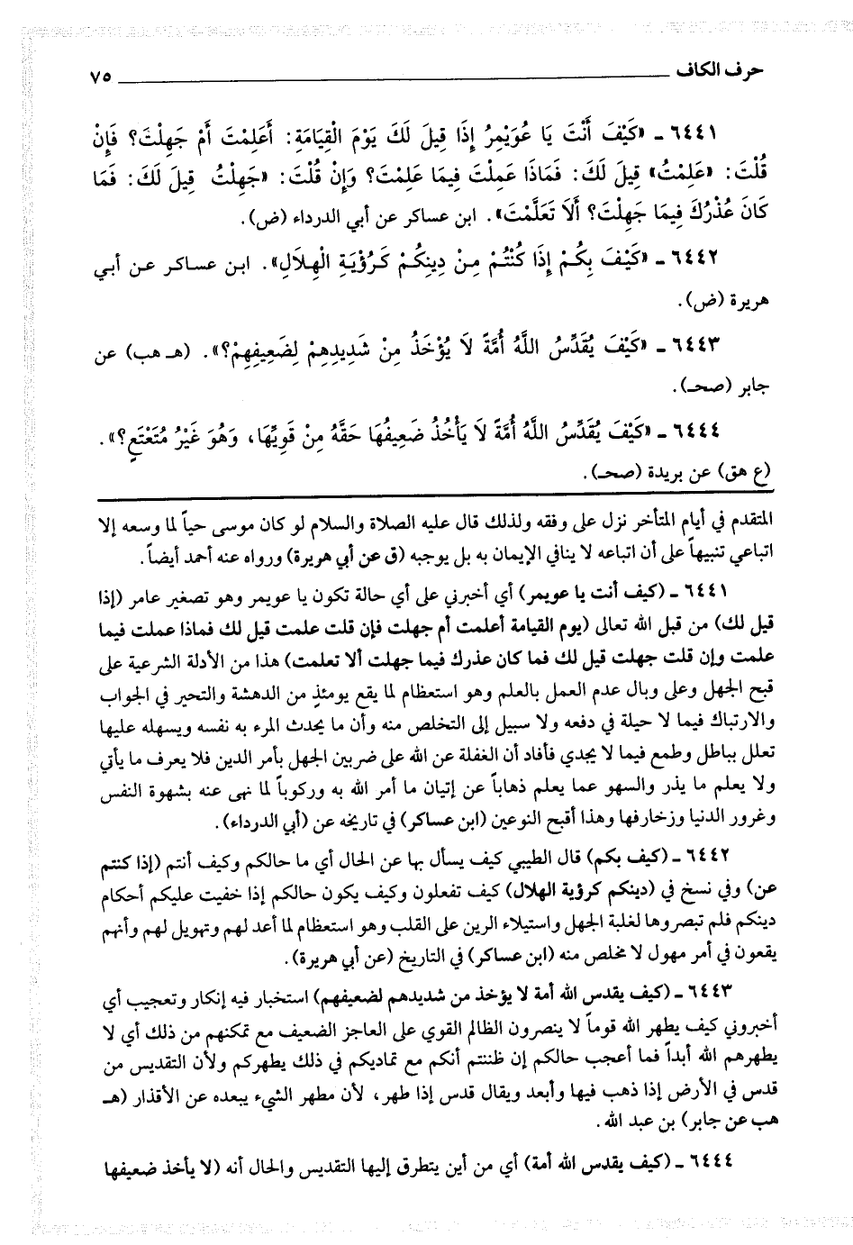 6443 - (كيف يقدس الله أمة لا يؤخذ من شديدهم لضعيفهم) استخبار فيه إنكار وتعجيب أي أخبروني كيف يطهر الله قوما لا ينصرون الظالم القوي على العاجز الضعيف مع تمكنهم من ذلك أي لا يطهرهم الله أبدا فما أعجب حالكم إن ظننتم أنكم مع تماديكم في ذلك يطهركم ولأن التقديس من قدس في الأرض إذا ذهب فيها وأبعد ويقال قدس إذا طهر، لأن مطهر الشئ يبعده عن الأفذار.