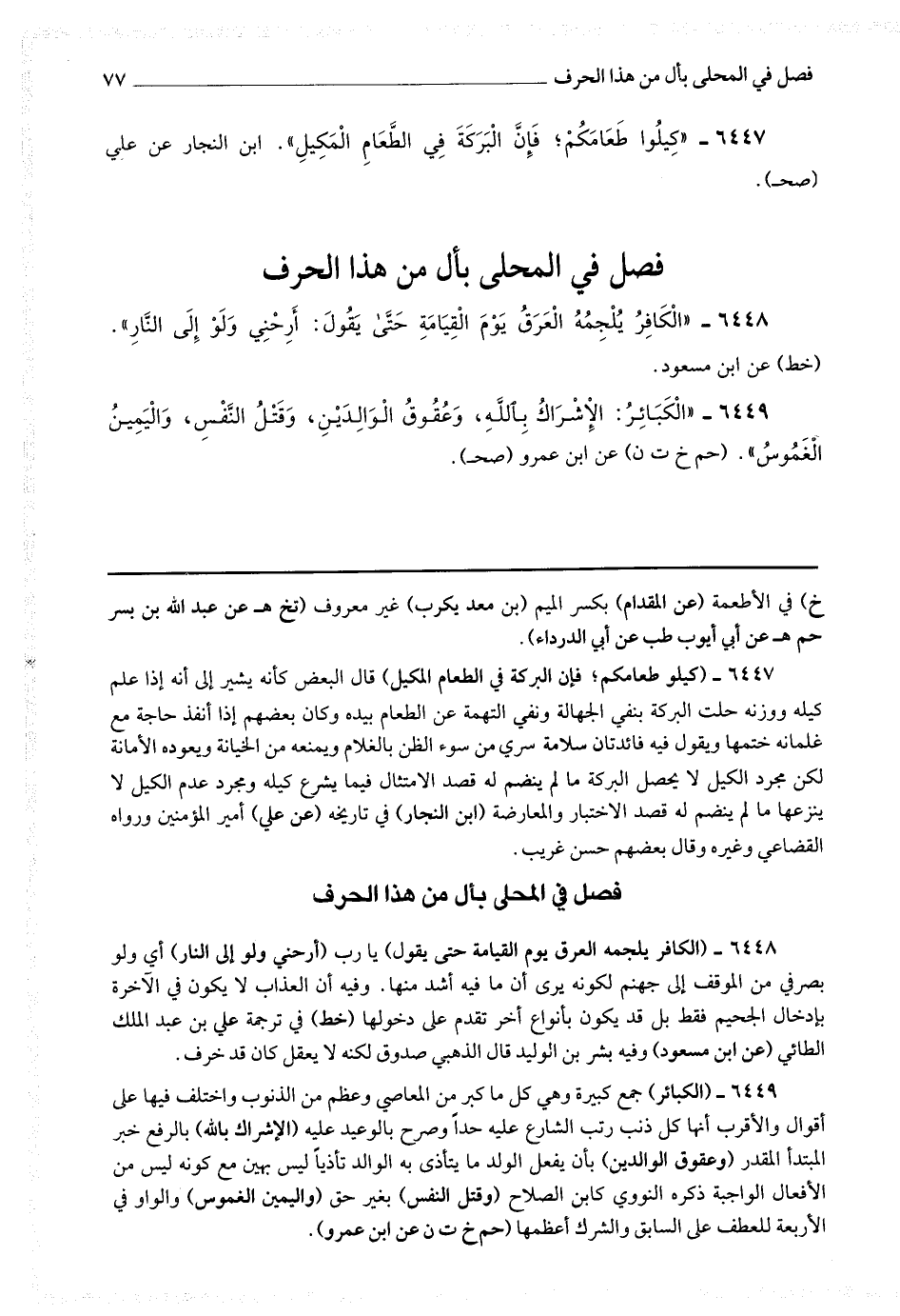 6449 - (الكبائر) جمع كبيرة وهي كل ما كبر من المعاصي وعظم من الذنوب واختلف فيها على أقوال والأقرب أنها كل ذنب رتب الشارع عليه حدا وصرح بالوعيد عليه (الإشراك بالله) بالرفع خبر المبتدأ المقدر (وعقوق الوالدين) بأن يفعل الولد ما يتأذى به الوالد تأذيا ليس بهين مع كونه ليس من الأفعال الواجبة ذكره النووي كابن الصلاح (وقتل النفس) بغير حق (واليمين الغموس) والواو في الأربعة للعطف على السابق والشرك أعظمها.
