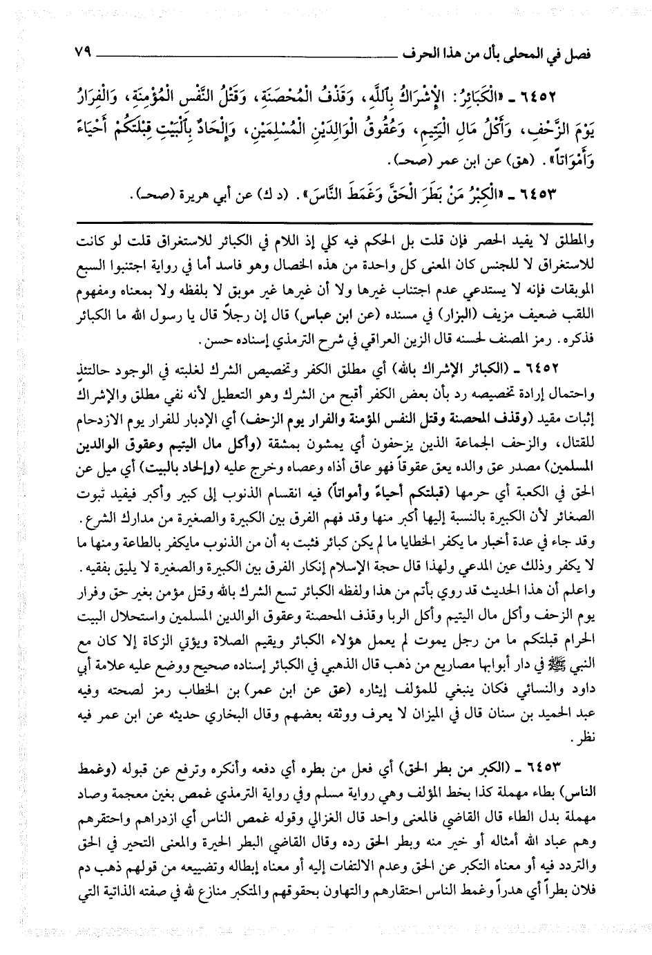 6452 - (الكبائر الإشراك بالله) أي مطلق الكفر وتخصيص الشرك لغلبته في الوجود حالتئذ واحتمال إرادة تخصيصه رد بأن بعض الكفر أقبح من الشرك وهو التعطيل لأنه نفي مطلق والإشراك إثبات مقيد (وقذف المحصنة وقتل النفس المؤمنة والفرار يوم الزحف) أي الإدبار للفرار يوم الازدحام للقتال والزحف الجماعة الذين يزحفون أي يمشون بمشقة (وأكل مال اليتيم وعقوق الوالدين المسلمين) مصدر عق والده يعق عقوقا فهو عاق أذاه وعصاه وخرج عليه (وإلحاد بالبيت) أي ميل عن الحق في الكعبة أي حرمها (قبلتكم أحياءا وأمواتا) فيه انقسام الذنوب إلى كبير وأكبر فيفيد ثبوت الصغائر لأن الكبيرة بالنسبة إليها أكبر منها وقد فهم الفرق بين الكبيرة والصغيرة من مدارك الشرع وقد جاء في عدة أخبار ما يكفر الخطايا ما لم يكن كبائر فثبت به أن من الذنوب ما يكفر بالطاعة ومنها ما لا يكفر وذلك عين المدعي ولهذا قال حجة الإسلام : إنكار الفرق بين الكبيرة والصغيرة لا يليق بفقيه واعلم أن هذا الحديث قد روى بأتم من هذا ولفظه الكبائر تسع الشرك بالله وقتل مؤمن بغير حق وفرار يوم الزحف وأكل مال اليتيم وأكل الربا وقذف المحصنة وعقوق الوالدين المسلمين واستحلال البيت الحرام قبلتكم ما من رجل يموت لم يعمل هؤلاء الكبائر ويقيم الصلاة ويؤتي الزكاة إلا كان مع النبي صلى الله عليه وسلم في دار أبوابها مصاريع من ذهب قال الذهبي في الكبائر : إسناده صحيح ووضع عليه علامة أبي داود والنسائي فكان ينبغي للمؤلف إيثاره.