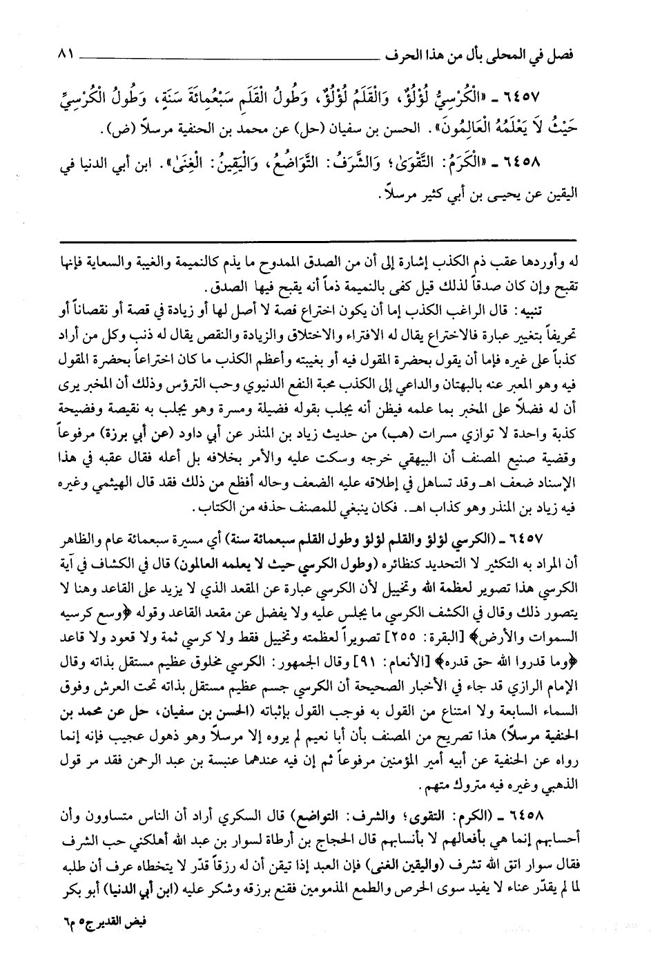 6457 - (الكرسي لؤلؤ والقلم وطول القلم سبعمائة سنة) أي مسيرة سبعمائة عام والظاهر أن المراد به التكثير لا التحديد كنظائره (وطول الكرسي حيث لا يعلمه العالمون) قال في الكشاف : في آية الكرسي هذا تصوير لعظمة الله وتخييل لأن الكرسي عبارة عن المعقد الذي لا يزيد على القاعد وهنا لا يتصور ذلك وقال في الكشف : الكرسي ما يجلس عليه ولا يفضل عن مقعد القاعد وقوله * (وسع كرسيه السماوات والأرض) * تصويرا لعظمته وتخييل فقط ولا كرسي ثمة ولا قعود ولا قاعد * (وما قدروا الله حق قدره) * اه.