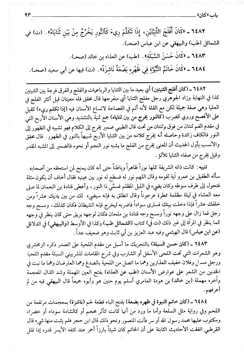 6482 - (كان أفلج الثنيتين) أي بعيد ما بين الثنايا والرباعيات والفلج والفرق فرجة بين الثنيتين كذا في النهاية وزاد الجوهري رجل مفلج الثنايا أي منفرجها قال محقق: فله معيتان قيل أكثر الفلج في العليا وهي صفة جميلة لكن مع القلة لأنه أتم في الفصاحة لاتساع الأسنان فيه (إذا تكلم رئ) كقيل على الأفصح وروي كضرب (كالنور يخرج من بين ثناياه) جمع ثنية بالتشديد وهي الأسنان الأربع التي في مقدم الفم ثنتان من فوق وثنتان من تحت قال الطيبي: ضميره يخرج إلى الكلام فهو تشبيه في الظهور إلى النور فالكاف زائدة وحاصله أنه يخرج كلامه من بين الثنايا الأربع شبيها بالنور في الظهور قال محقق: والأنسب بأول الحديث أن المعنى يخرج من الفلج ما يشبه نور النجم أو نحوه فالضمير إلى المشبه المقدر وقيل يخرج من صفاء الثنايا تلألؤ (تنبيه) كانت ذاته الشريفة كلها نورا ظاهرا وباطنا حتى أنه كان يمنح لمن استحقه من أصحابه سأله الطفيل بن عمرو آية لقومه وقال: اللهم نور له فسطع له نور بين عينيه فقال: أخاف أن يكون مثلة فتحول إلى طرف سوطه وكان يضئ في الليل المظلم فسمي ذا النور وأعطى قتادة بن النعمان لما صلى معه العشاء في ليلة مظلمة ممطرة عرجونا وقال: انطلق به فإنه سيضئ له من بين يديك عشرا ومن خلفك عشرا فإذ دخلت بيتك فسترى سوادا فاضربه ليخرج فإنه الشيطان فكان كذلك ومسح وجه رجل فما زال على وجهه نورا ومسح وجه قتادة بن ملحان فكان لوجهه بريق حتى كان ينظر في وجهه