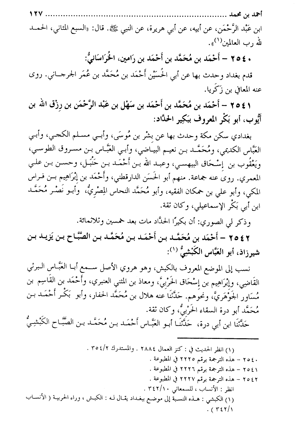 2542-[4] أَحْمَدَ بْن مُحَمَّد بْن أَحْمَد بْن مُحَمَّد بْن الصَّبَاحِ بْنِ يَزِيدَ بْنِ شيرزاذ، أَبُو الْعَبَّاسِ الْكَبْشِيُّ [5] :