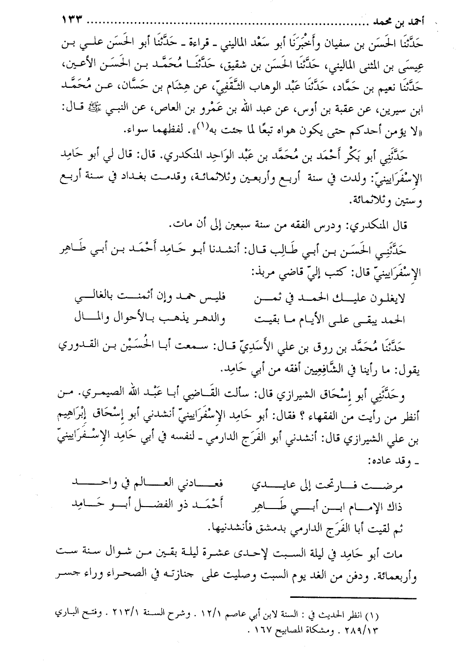 حَدَّثَنَا الْحَسَنُ بْنُ سُفْيَانَ وَأَخْبرَنَا أَبُو سَعْدٍ الماليني- قراءة- حَدَّثَنَا أَبُو الْحَسَنِ عَلِيُّ بْنُ عِيسَى بْنِ المثنى الماليني، حدّثنا الحسن بن شقيق، حدّثنا محمّد بن الحسن الأعين، حدّثنا نعيم بن حمّاد، حَدَّثَنَا عَبْدُ الْوَهَّابِ الثَّقَفِيُّ، عَنْ هِشَامِ بْنَ حسّان، عن محمّد ابن سِيرِينَ، عَنْ عُقْبَةَ بْنِ أَوْسٍ، عَنْ عَبْدِ اللَّهِ بْنِ عَمْرٍو بْنِ الْعَاصِ، عَنِ النَّبِيِّ صَلَّى اللَّهُ عَلَيْهِ وَسَلَّمَ قَالَ: «لا يُؤْمِنُ أَحَدُكُمْ حَتَّى يَكُونَ هَوَاهُ تَبَعًا لِمَا جِئْتُ بِهِ [1] »