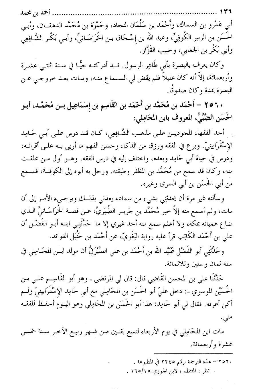2560- أَحْمَد بْن مُحَمَّد بْن أَحْمَد بْن الْقَاسِم بْن إسماعيل بن محمد، أَبُو الحسن الضبي، المعروف بابن المحاملي [1] :