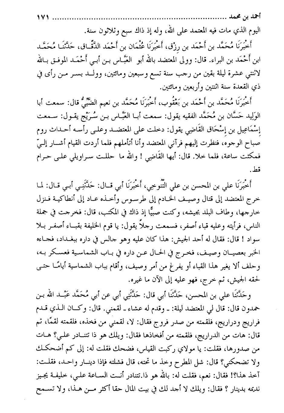 أَخْبَرَنَا مُحَمَّد بْن أَحْمَد بن يعقوب، أخبرنا محمد بن نعيم الضبي قال: سمعت أبا الوليد حسان بن محمد الفقيه يَقُولُ: سَمِعْتُ أَبَا الْعَبَّاس بْن سريج يَقُولُ: سمعت إسماعيل بْن إسحاق القاضي يقول: دخلت عَلَى المعتضد وعلى رأسه أحداث روم صباح الوجوه، فنظرت إليهم فرآني المعتضد وانا أتأملهم فلما أردت القيام أشار إِلَى فمكثت ساعة، فلما خلا. قَالَ: أيها القاضي! وَالله ما حللت سراويلي عَلَى حرام قط.
