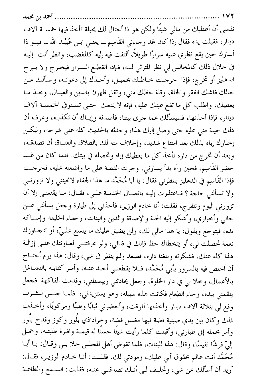نفسي أن أعطيك من مالي شيئا ولكن هو ذا أحتال لك بحيلة تأخذ فِيهَا خمسة آلاف دينار، فقبلت يده فقال إذا كَانَ غد وجاءني القاسم- يعني ابْن عبيد اللَّه- فهو ذا أسارك حين يقع نظري عَلَيْهِ سرارا طويلا، ألتفتُ فِيهِ إليه كالمغضب، وانظر أنت إليه فِي خلال ذلك كالمخالس لي نظر المترثي له، فإذا انقطع السرار فِيخرج ولا يبرح الدهليز أو تخرج، فإذا خرجت خاطبك بجميل، وأخذك إِلَى دعوته، وسألك عَن حالك فاشك الفقر وَالخلة، وقلة حظك مني، وثقل ظهرك بالدين وَالعيال، وخذ ما يعطيك، واطلب كل ما تقع عينك عَلَيْهِ، فإنه لا يمنعك حتى تستوفي الخمسة آلاف دينار، فإذا أخذتها، فسيسألك عما جرى بيننا، فاصدقه وإياك أن تكذبه، وعرفه أن ذلك حيلة مني عَلَيْهِ حتى وصل إليك هذا، وحدثه بالحديث كله عَلَى شرحه، وليكن إخبارك إياه بذلك بعد امتناع شديد، وإحلاف منه لك بالطلاق وَالعتاق أن تصدقه، وبعد أن تخرج من داره تأخذ كل ما يعطيك إياه وتحصله فِي بيتك. فلما كَانَ من غد حضر القاسم، فحين رآه بدأ يسارني، وجرت القصة عَلَى ما واضعته عَلَيْهِ، فخرجت فإذا القاسم فِي الدهليز ينتظرني فقال: يا أبا مُحَمَّد ما هذا الجفاء لا تجيئني ولا تزورني ولا تسألني حاجة؟ فاعتذرت إليه باتصال الخدمة علي، فقال: ما يقنعني إلا أن تزورني اليوم ونتفرج، فقلت: أَنَا خادم الوزير، فأخذني إِلَى طياره وجعل يسألني عَن حالي وأخباري، وأشكو إليه الخلة والإضاقة وَالدين وَالبنات، وجفاء الخليفة وإمساكه يده، فيتوجع ويقول: يا هذا مالي لك، ولن يضيق عليك ما يتسع عَلَيَّ، أو تتجاوزك نعمة تحصلت لي، أو يتخطاك حظ فإنك فِي فنائي، ولو عرفتني لعاونتك عَلَى إزالة هذا كله عنك، فشكرته وبلغنا داره، فصعد ولم ينظر في شيء وقال: هذا يوم أحتاج أن أختص فِيهِ بالسرور بأبي مُحَمَّد، فلا يقطعني أحد عنه، وأمر كتابه بالتشاغل بالأعمال، وخلا بي فِي دار الخلوة، وجعل يحادثني ويبسطني، وقدمت الفاكهة فجعل يلقمني بيده، وجاء الطعام فكَانَت هذه سبيله، وهو يستزيدني، فلما جلس للشرب وقع لي بثلاثة آلاف دينار وأخذتها للوقت، وأحضرني ثيابا وطيبا ومركوبا، وأخذت ذلك وكَانَ بين يدي صينية فضة فِيهَا مغسل فضة، وخراداذي بلور وكوز وقدح بلور وأمر بحمله إِلَى طيارتي، وأقبلت كلما رأيت شيئا حسنا له قيمة وافرة طلبته، وحمل إِلَيَّ فرشا نفِيسا، وَقَالَ: هذا للبنات، فلما تقوض أهل المجلس خلا بي وَقَالَ: يا أَبا مُحَمَّد أنت عالم بحقوق أَبِي عليك، ومودتي لك. فقلت: أَنَا خادم الوزير، فقال: