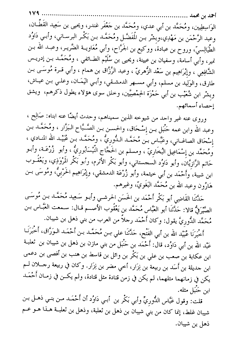 حَدَّثَنَا الْقَاضِي أَبُو بَكْرٍ أَحْمَدُ بْنُ الْحَسَنِ الْحَرَشِيُّ وَأَبُو سَعِيدٍ مُحَمَّد بْن مُوسَى الصيرفِي قَالا: حَدَّثَنَا أَبُو العباس مُحَمَّد بْن يعقوب الأصم قَالَ: سمعتُ الْعَبَّاس بْن مُحَمَّد الدوري يَقُولُ: وكَانَ أَحْمَد رجلا من العرب من بني ذهل بْن شيبان.