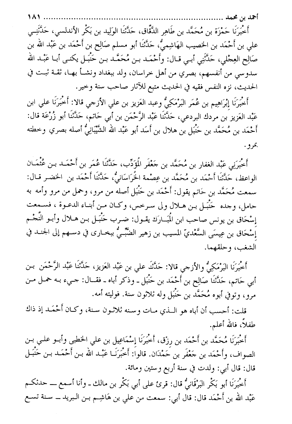 أخبرنا حمزة بن محمد بن طاهر الدقاق، حدّثنا الوليد بن بكر الأندلسي، حَدَّثَنِي عَلِيّ بْن أَحْمَد بْن الخصيب الهاشمي، حدثنا أبو مسلم صالح بن أحمد بن عبد الله بن صالح العجلي، حَدَّثَنِي أَبِي قَالَ: وأَحْمَد بْن مُحَمَّد بْن حَنْبَل يكنى أبا عَبْد اللَّه سدوسي من أنفسهم، بصري من أهل خراسان، ولد ببغداد ونشأ بها، ثقة ثبت فِي الحديث، نزه النفس فقيه في الحديث متبع للآثار صاحب سنة وخير.