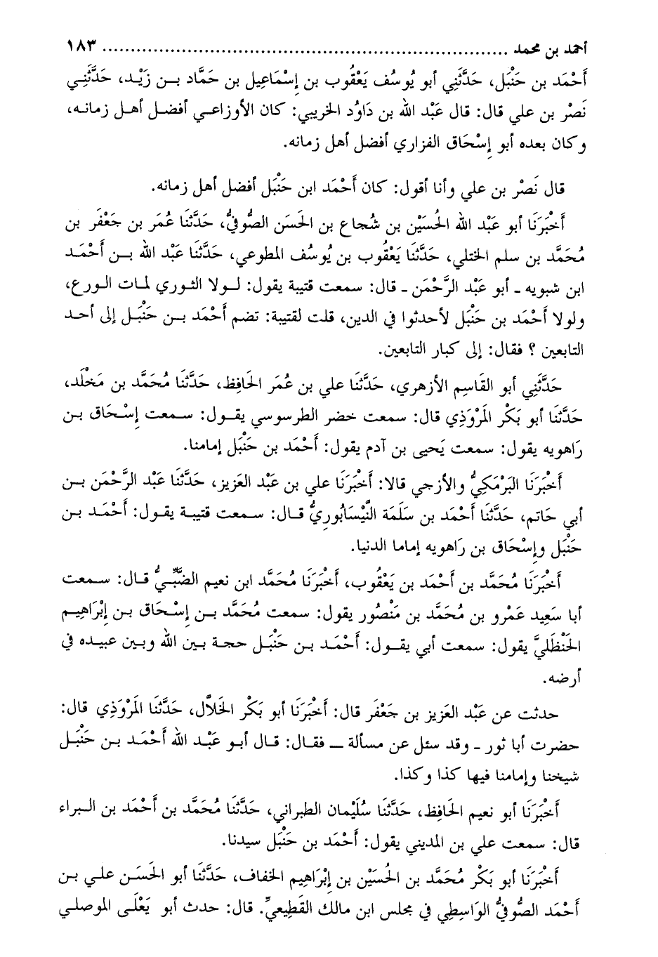 أَخْبَرَنَا مُحَمَّد بْن أَحْمَد بن يعقوب، أخبرنا محمّد ابن نعيم الضبي قَالَ: سمعت أبا سعيد عمرو بْن مُحَمَّد بْن منصور يقول: سمعت مُحَمَّد بْن إسحاق بْن إِبْرَاهِيم الحنظلي يقول: سمعت أَبِي يقول: أَحْمَد بْن حَنْبَل حجة بين اللَّه وبين عبيده فِي أرضه.