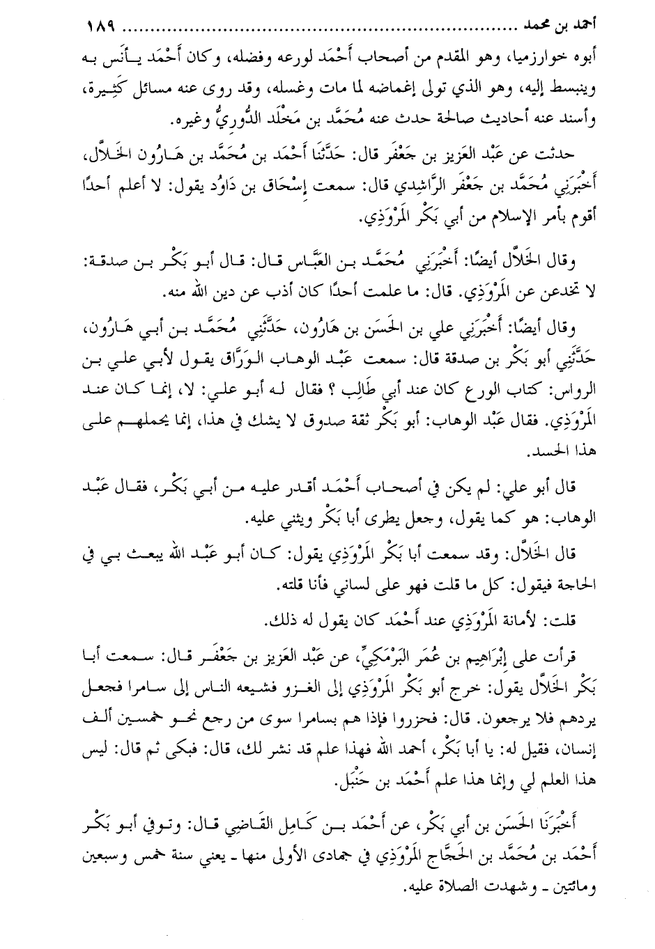 وَقَالَ أيضا: أَخْبَرَنِي عَلِيّ بْن الحسن بْن هارون، حدّثني محمّد بن أبي هارون، حَدَّثَنِي أَبُو بَكْر بْن صدقة قَالَ: سَمِعْتُ عَبْد الوهاب الوراق يقول لأبي علي بْن الرواس: كتاب الورع كَانَ عند أَبِي طالب؟ فقال له أَبُو علي: لا، إنما كَانَ عند المروذي. فقال عَبْد الوهاب: أَبُو بَكْر ثقة صدوق لا يشك فِي هذا، إنما يحملهم عَلَى هذا الحسد.