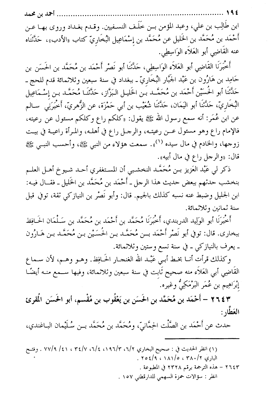 أَخْبَرَنَا الْقَاضِي أبو العلاء الواسطي، حَدَّثَنَا أَبُو نَصْرٍ أَحْمَدُ بْنُ مُحَمَّدِ بْن الْحَسَنِ بْنِ حَامِدِ بْنِ هَارُونَ بْنِ عَبْدِ الجبّار البخاريّ- ببغداد في سنة سبعين وثلاثمائة قدم للحج-