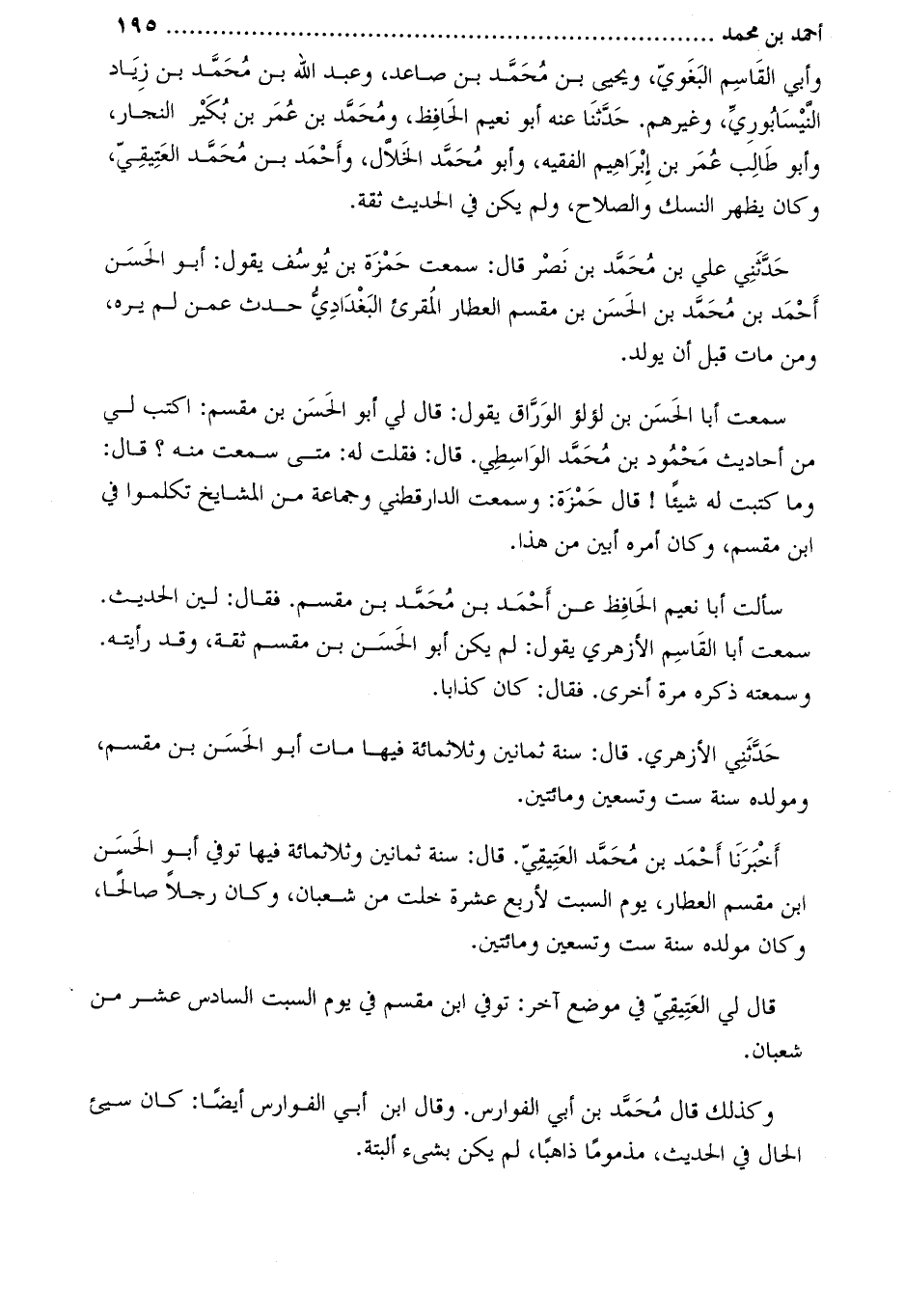 قال لي العتيقي في موضع آخر: توفي ابن مقسم في يوم السبت السادس عشر من شعبان.