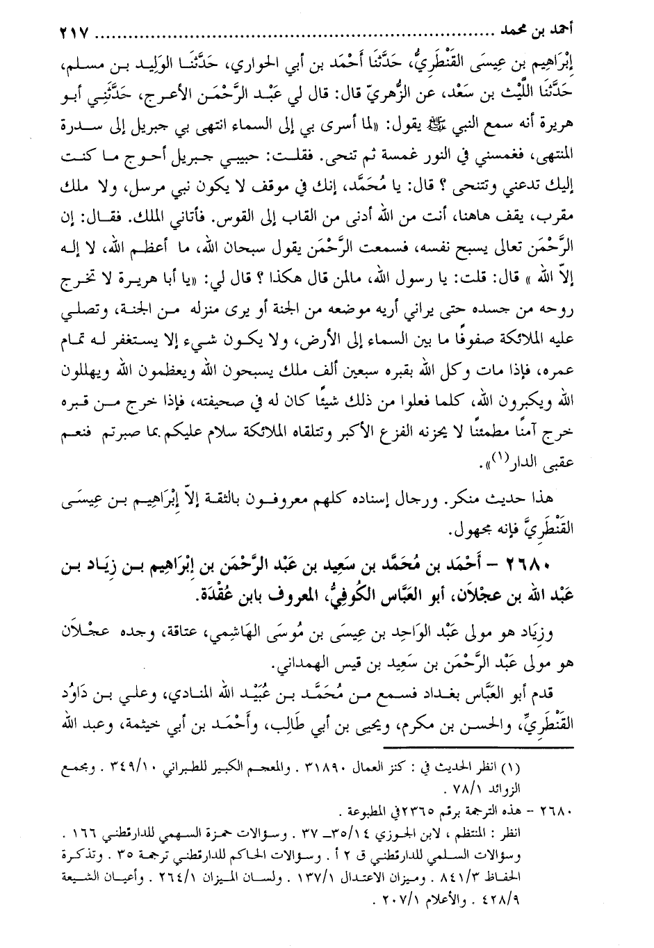 إبراهيم بن عيسى القنطريّ، حدّثنا أحمد بن أبي الحواري، حدّثنا الوليد بن مسلم، حَدَّثَنَا اللَّيْثُ بْنُ سَعْدٍ، عَنْ الزُّهْرِيِّ قَالَ: قَالَ لِي عَبْدُ الرَّحْمَنِ الأَعْرَجُ، حَدَّثَنِي أَبُو هُرَيْرَةَ أَنَّهُ سَمِعَ النَّبِيَّ صَلَّى اللَّهُ عَلَيْهِ وَسَلَّمَ يَقُولُ: «لَمَّا أُسْرِيَ بِي إِلَى السَّمَاءِ انْتَهَى بِي جِبْرِيلُ إِلَى سِدْرَةِ الْمُنْتَهَى، فَغَمَسَنِي فِي النُّورِ غَمْسَةً ثُمَّ تَنَحَّى. فَقُلْتُ: حَبِيبِي جِبْرِيلُ أَحْوَجُ مَا كُنْتُ إِلَيْكَ تَدَعُنِي وَتَتَنَحَّى؟ قَالَ: يَا مُحَمَّدُ، إِنَّكَ فِي مَوْقِفُ لا يَكُونُ نَبِيٌّ مُرْسَلٌ، وَلا مَلَكٌ مُقَرَّبٌ، يَقِفُ هاهنا، أَنْتَ مِنَ اللَّهِ أَدْنَى مِنْ أَلْقَابِ إِلَى الْقَوْسِ. فَأَتَانِي الْمَلَكُ. فَقَالَ: إِنَّ الرَّحْمَنَ تَعَالَى يُسَبِّحُ نَفْسَهُ، فَسَمِعْتُ الرَّحْمَنَ يَقُولُ سُبْحَانَ اللَّهِ، مَا أَعْظَمَ اللَّهَ، لا إِلَهَ إِلا اللَّهُ» قَالَ: قُلْتُ: يَا رَسُولَ اللَّهِ، مَا لِمَنْ قَالَ هَكَذَا؟ قَالَ لِي: «يَا أَبَا هُرَيْرَةَ لا تَخْرُجُ رُوحُهُ مِنْ جَسَدِهِ حَتَّى يَرَانِي أُرِيهِ مَوْضِعَهُ مِنَ الْجَنَّةِ أَوْ يَرَى مَنْزِلَهُ مِنَ الْجَنَّةِ، وَتُصَلِّي عَلَيْهِ الْمَلائِكَةَ صُفُوفًا مَا بَيْنَ السَّمَاءِ إِلَى الأَرْض، وَلا يَكُونُ شَيْءٌ إلا يَسْتَغْفِرُ لَهُ تَمَامَ عُمْرِهِ، فَإِذَا مَاتَ وَكَّلَ اللَّهُ بِقَبْرِهِ سَبْعينَ أَلْفَ مَلَكٍ يُسَبِّحُونَ اللَّهَ وَيُعَظِّمُونَ اللَّهَ وَيُهَلِّلُونَ اللَّهَ وَيُكَبِّرُونَ اللَّهَ، كُلَّمَا فَعَلُوا مِنْ ذَلِكَ شَيْئًا كَانَ لَهُ فِي صَحِيفَتِهِ، فَإِذَا خَرَجَ مِنْ قَبْرِهِ خَرَجَ آمِنًا مُطْمَئِنًّا لا يَحْزُنُهُ الْفَزَعُ الأَكْبَرُ وَتَتَلَقَّاهُ الْمَلائِكَةُ سَلامٌ عَلَيْكُمْ بِمَا صَبَرْتُمْ فَنِعْمَ عُقْبَى الدَّارِ [1] »