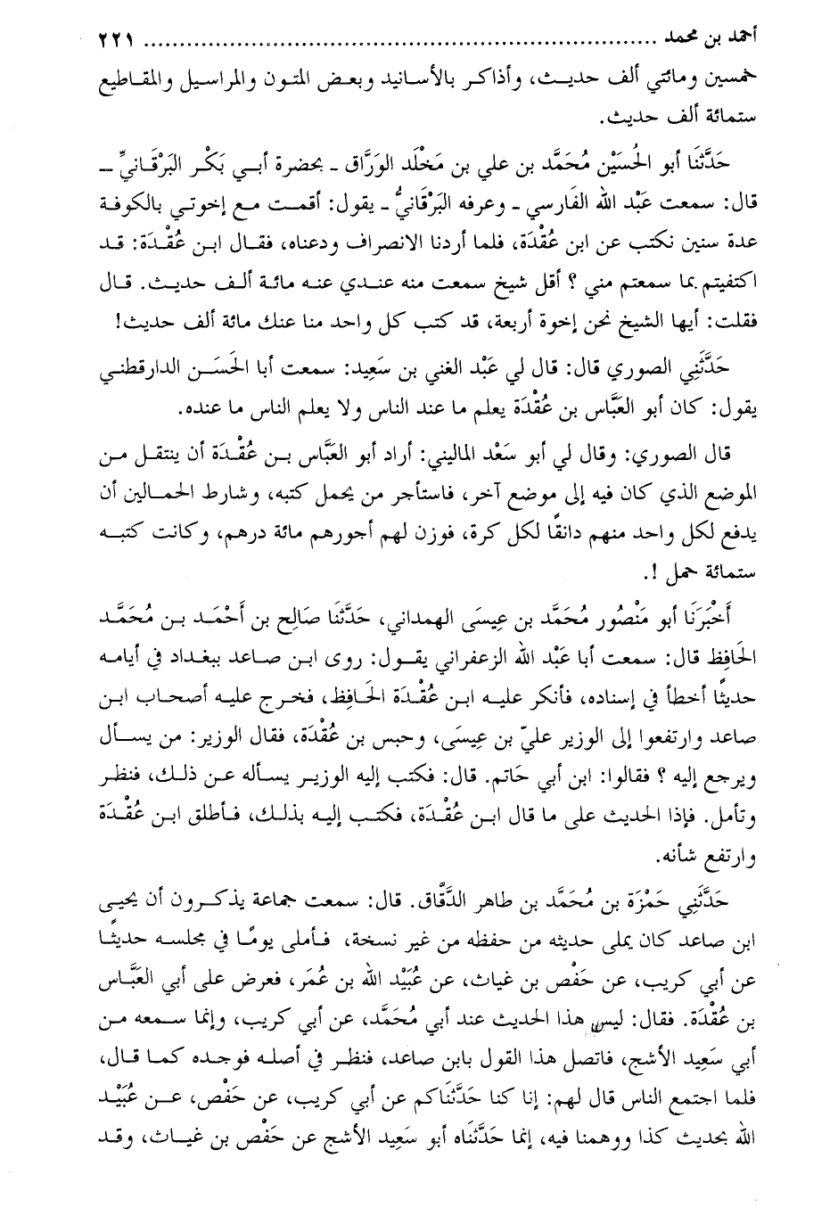 حَدَّثَنَا أَبُو الْحُسَيْنِ مُحَمَّدُ بْنُ عَلِيِّ بْنِ مخلد الوراق- بحضرة أَبِي بكر البرقاني- قَالَ: سمعت عَبْد اللَّه الفارسي- وعرفه البرقاني- يقول: أقمت مع إخوتي بالكوفة عدة سنين نكتب عَن ابْن عقدة، فلما أردنا الانصراف ودعناه، فقال ابن عقدة: قد اكتفِيتم بما سمعتم مني؟ أقل شيخ سمعت منه عندي عنه مائة ألف حديث. قَالَ فقلت: أيها الشيخ نحن إخوة أربعة، قد كتب كل واحد منا عنك مائة ألف حديث! حَدَّثَنِي الصُّورِيُّ قَالَ: قَالَ لِي عَبْد الْغَنِيِّ بْن سَعِيدٍ: سمعت أبا الْحَسَن الدارقطني يَقُول: كَانَ أَبُو العباس بْن عقدة يعلم ما عند الناس ولا يعلم الناس ما عنده.