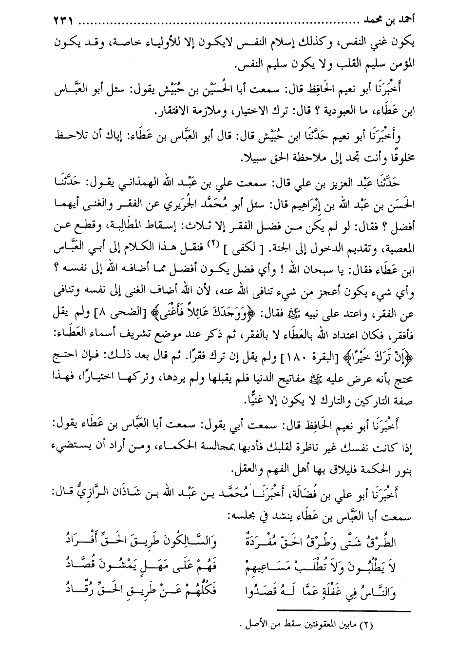 حَدَّثَنَا عَبْد العزيز بن علي قَالَ: سَمِعْتُ عَلِيّ بْن عَبْد اللَّه الهمذاني يقول: حَدَّثَنَا الحسن بْن عَبْد اللَّه بْن إِبْرَاهِيم قَالَ: سئل أَبُو مُحَمَّد الجريري عَنِ الفقر وَالغنى أيهما أفضل؟ فقال: لو لم يكن من فضل الفقر إلا ثلاث: إسقاط المطالبة، وقطع عن المعصية، وتقديم الدخول إلى الجنة. [لكفى] [1] فنقل هذا الكلام إلى أبي العبّاس ابن عطاء فقال: يا سبحان الله! وأي فضل يكون أفضل مما أضافه الله إلى نفسه؟