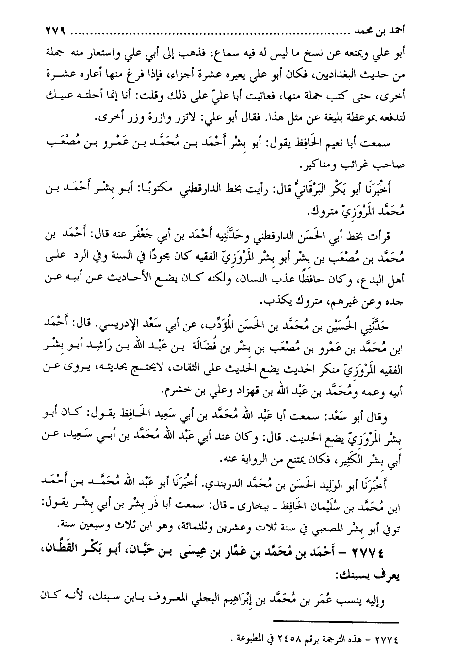 2774- أَحْمَد بْن مُحَمَّد بْن عمار بْن عِيسَى بْن حيان، أَبُو بَكْر القطان، يعرف بسبنك [1] :