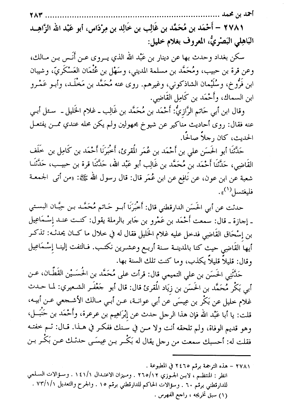 2781- أَحْمَد بْن مُحَمَّد بْن غالب بْن خالد بْن مرداس، أَبُو عَبْد اللَّهِ الزاهد الباهلي البصري، المعروف بغلام خليل [1] :