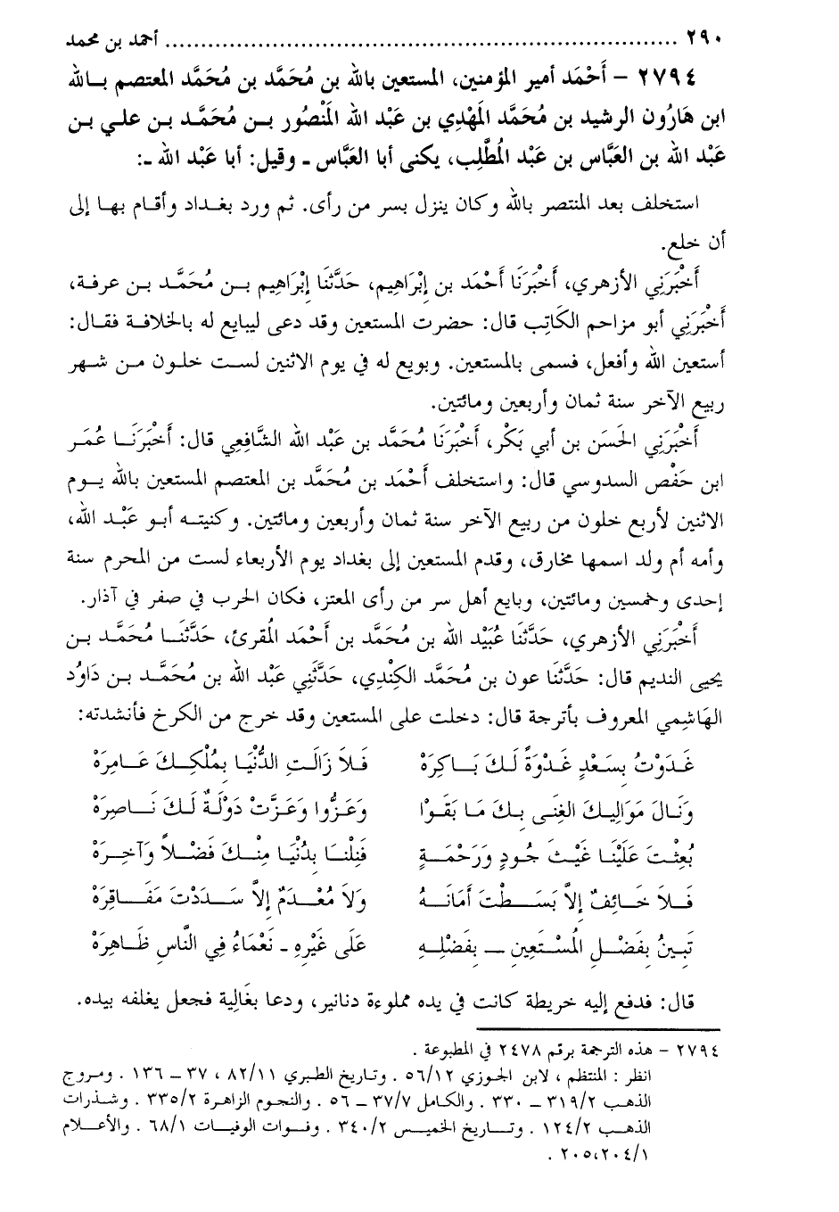 2794- أَحْمَد أمير المؤمنين، المستعين بالله بْن مُحَمَّد بن محمّد المعتصم بالله ابن هارون الرشيد بن محمد المهدي بن عبد الله المنصور بْن مُحَمَّدِ بْنِ عَلِيّ بْن عَبْدِ اللَّه بن العباس بن عبد المطلب، يكنى أبا الْعَبَّاس- وقيل: أبا عَبْد اللَّهِ-[1] :