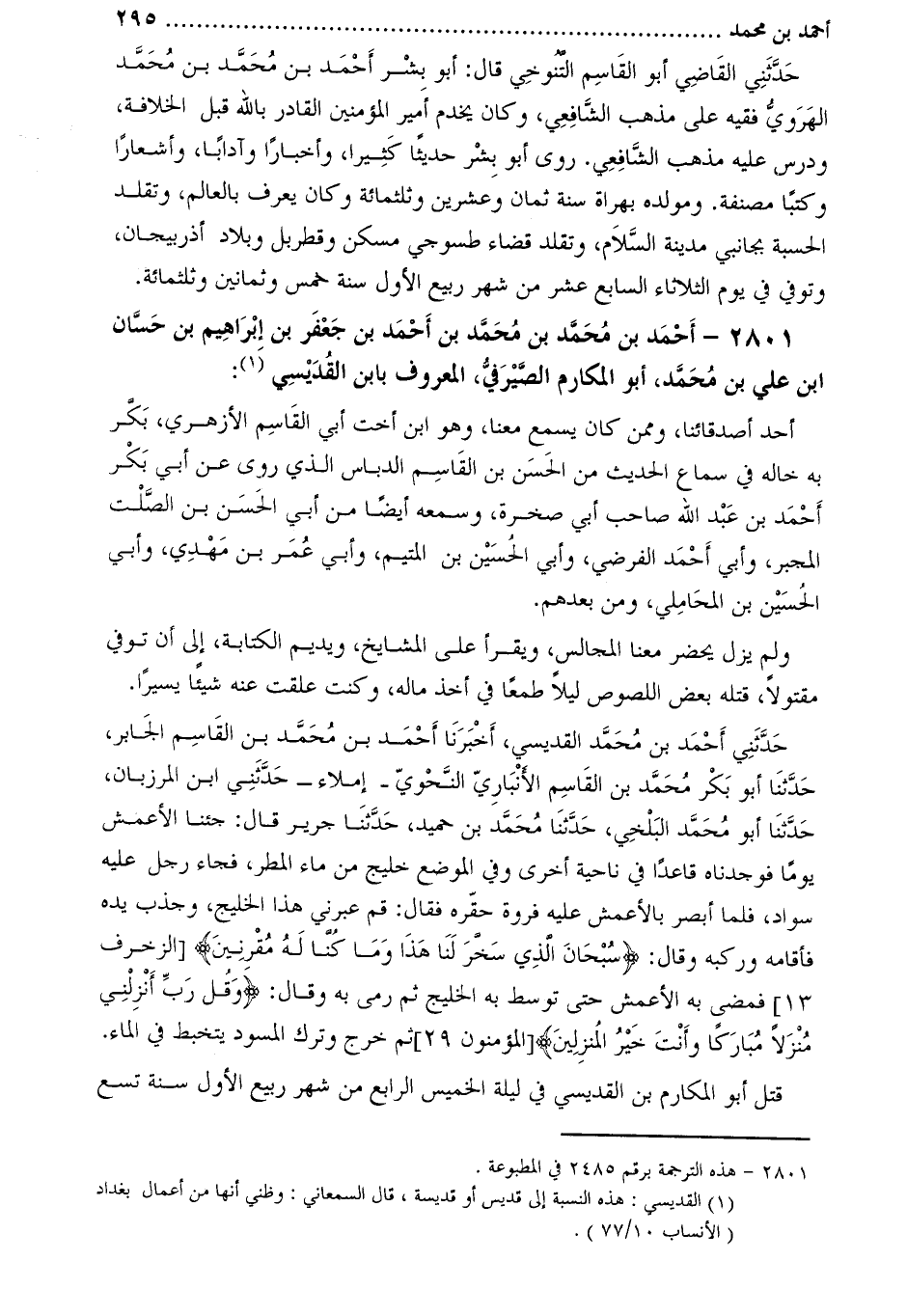 2801-[1] أَحْمَد بْنُ مُحَمَّدِ بْنِ مُحَمَّدِ بْنِ أَحْمَدَ بْنِ جعفر بْن إبراهيم بن حسّان ابن عَلِيّ بْن مُحَمَّد، أَبُو المكارم الصيرفِي، المعروف بابن القديسي [2] :