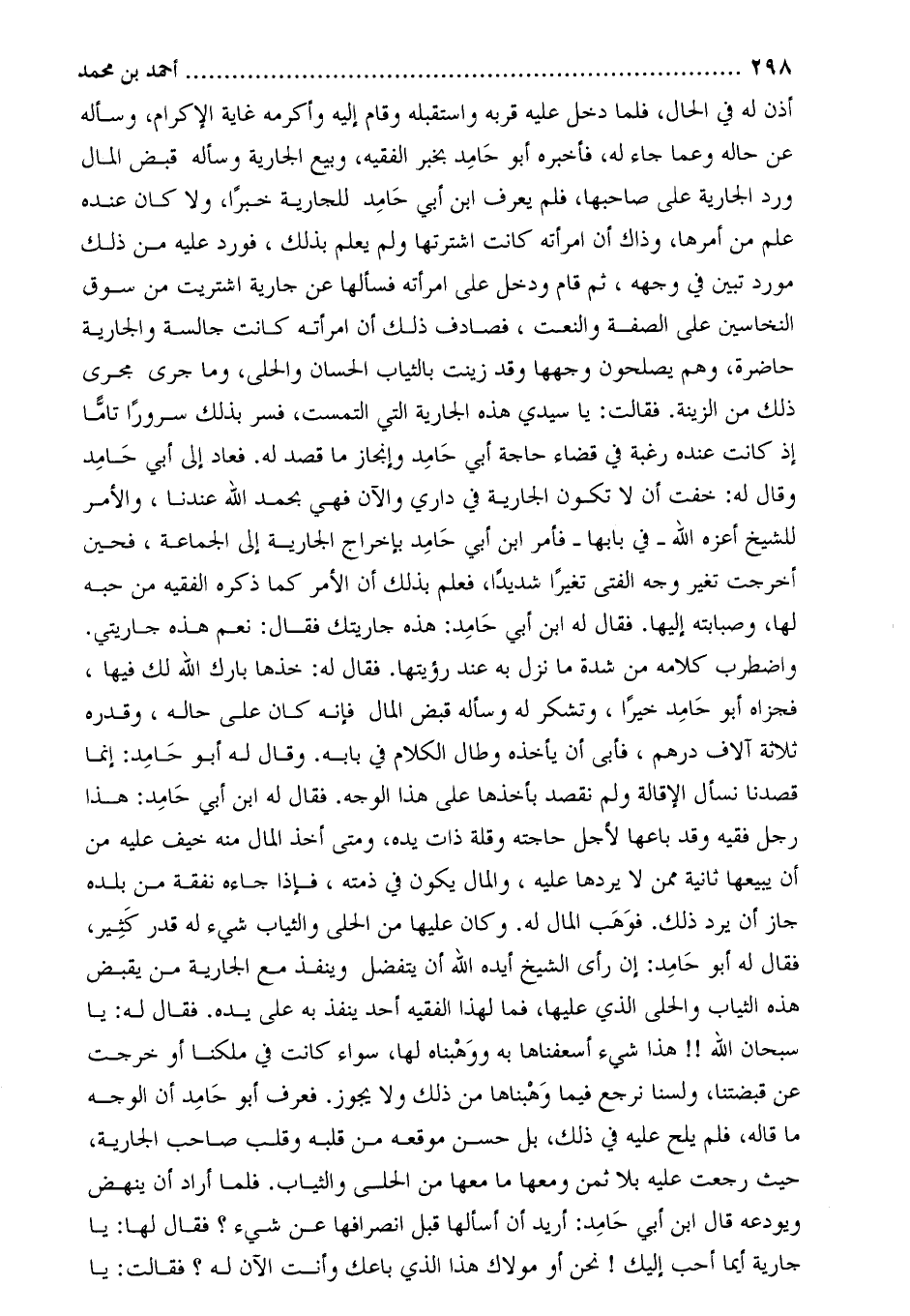 واضطرب كلامه من شدة ما نزل بِهِ عند رؤيتها. فَقَالَ له: خذها بارك اللَّه لَكَ فِيهَا، فجزاه أَبُو حامد خيرا، وتشكر له وسأله قبض المال فإنه كَانَ عَلَى حاله، وقدره ثلاثة آلاف درهم، فأبي أن يأخذه وطال الكلام فِي بابه. وَقَالَ له أَبُو حامد: إنما قصدنا نسأل الإقالة ولم نقصد بأخذها عَلَى هذا الوجه. فَقَالَ له ابْن أَبِي حامد: هذا رَجُل فقيه وقد باعها لأجل حاجته وقلة ذات يده، ومتى أخذ المال منه خيف عَلَيْهِ من أن يبيعها ثانية ممن لا يردها عَلَيْهِ، وَالمال يكون فِي ذمته، فإذا جاءه نفقة من بلده جاز أن يرد ذلك. فوهب المال له. وكَانَ عليها من الحلى وَالثياب شيء له قدر كثير، فَقَالَ له أَبُو حامد: إن رأى الشيخ أيده اللَّه أن يتفضل وينفذ مع الجارية من يقبض هذه الثياب وَالحلي الذي عليها، فما لهذا الفقيه أحد ينفذ به على يده. فَقَالَ له: يا سبحان اللَّه!! هذا شيء أسعفناها بِهِ ووهبناه لها، سواء كَانَت فِي ملكنا أو خرجت عَن قبضتنا، ولسنا نرجع فيما وهبناها من ذلك ولا يجوز. فعرف أَبُو حامد أن الوجه ما قاله، فلم يلح عَلَيْهِ فِي ذلك، بل حسن موقعه من قلبه وقلب صاحب الجارية، حيث رجعت عَلَيْهِ بلا ثمن ومعها ما معها من الحلى وَالثياب. فلما أراد أن ينهض ويودعه قال ابن أبي حامد: أريد أن أسألها قبل انصرافها عَن شيء؟ فَقَالَ لها: يا جارية أيما أحب إليك! نحن أو مولاك هذا الذي باعك وأنت الآن له؟ فقالت: يا