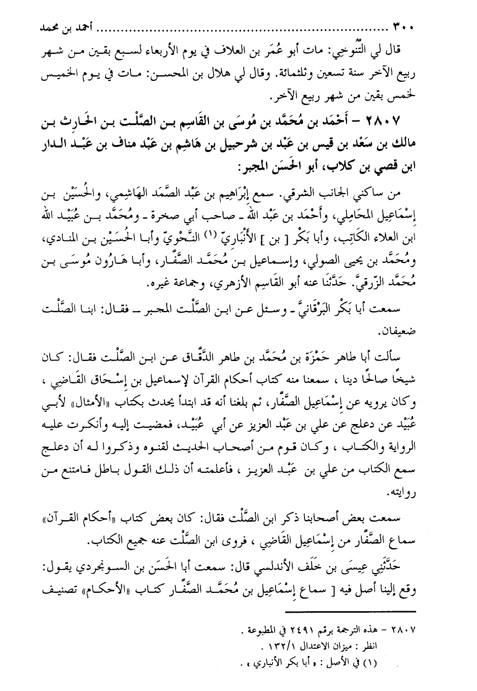 سمعت بعض أصحابنا ذكر ابن الصلت فَقَالَ: كَانَ بعض كتاب «أحكام القرآن» سماع الصّفّار من إسماعيل القاضي، فروى ابن الصلت عنه جميع الكتاب.