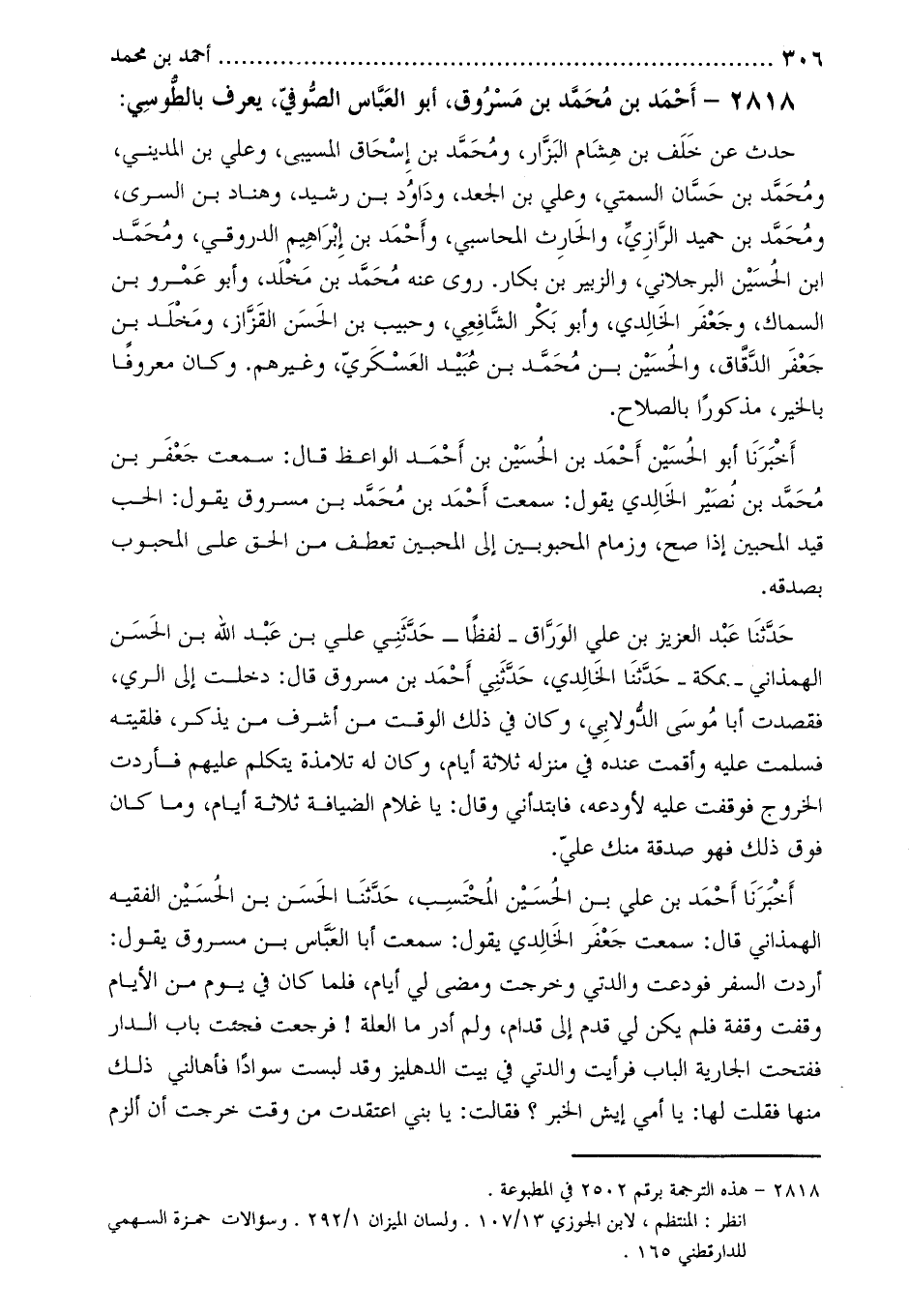 2818- أَحْمَد بْن مُحَمَّد بْن مسروق، أَبُو الْعَبَّاس الصوفِي، يعرف بالطوسي [1] :