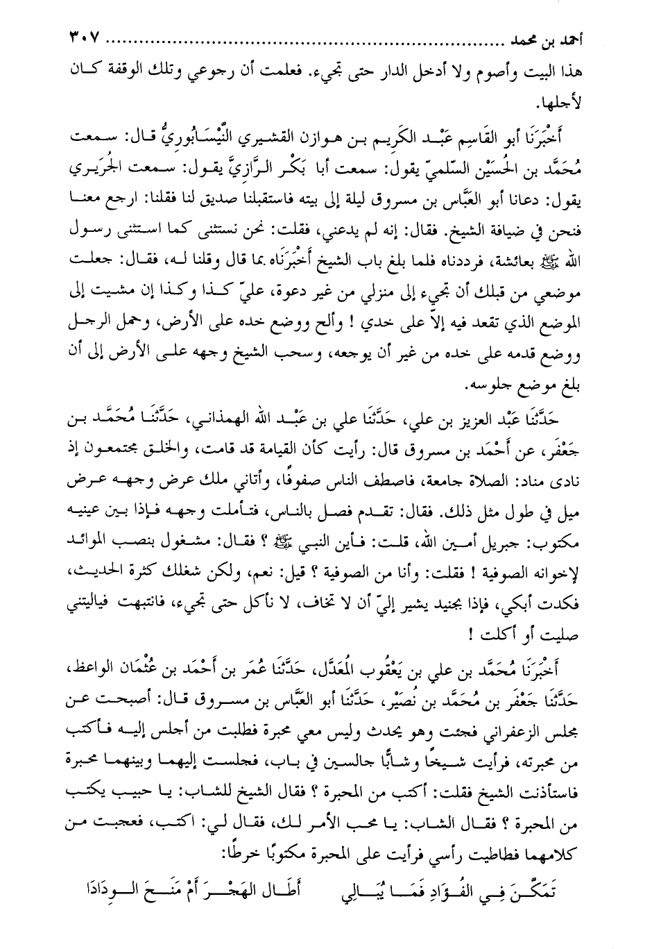 حَدَّثَنَا عَبْد العزيز بْن عَلِيٍّ، حدّثنا علي بن عبد الله الهمذاني، حَدَّثَنَا مُحَمَّد بْن جَعْفَر، عَن أَحْمَد بْن مسروق قَالَ: رأيت كأن القيامة قد قامت، وَالخلق مجتمعون إذ نادى مناد: الصلاة جامعة، فاصطف الناس صفوفا، وأتاني ملك عرض وجهه عرض ميل فِي طول مثل ذلك. فَقَالَ: تقدم فصل بالناس، فتأملت وجهه فإذا بين عينيه مكتوب: جبريل أمين اللَّه، قلت: فأين النَّبِيّ صلّى الله عليه وسلم؟ فقال: مشغول بنصب الموائد لإخوانه الصوفِية! فقلت: وأَنَا من الصوفِية؟ قيل: نعم، ولكن شغلك كثرة الحَدِيث، فكدت أبكي، فإذا بجنيد يشير إلي أن لا تخاف، لا نأكل حتى تجيء، فانتبهت فيا ليتني صليت أو أكلت! أَخْبَرَنَا مُحَمَّد بْن عَلِيّ بن يعقوب المعدل، حَدَّثَنَا عُمَرُ بْنُ أَحْمَدَ بْنِ عُثْمَانَ الْوَاعِظُ، حدّثنا جعفر بن محمّد بن نصير، حدّثنا أَبُو الْعَبَّاس بْن مسروق قَالَ: أصبحت عَن مجلس الزعفراني فجئت وَهُوَ يحدث وليس معي محبرة فطلبت من أجلس إليه فأكتب من محبرته، فرأيت شيخا وشابا جالسين فِي باب، فجلست إليهما وبينهما محبرة فاستأذنت الشيخ فقلت: أكتب من المحبرة؟ فَقَالَ الشيخ للشاب: يا حبيب يكتب من المحبرة؟ فَقَالَ الشاب: يا محب الأمر لَكَ، فَقَالَ لي: أكتب، فعجبت من كلامهما فطأطأت رأسي فرأيت عَلَى المحبرة مكتوبا خرطا:
