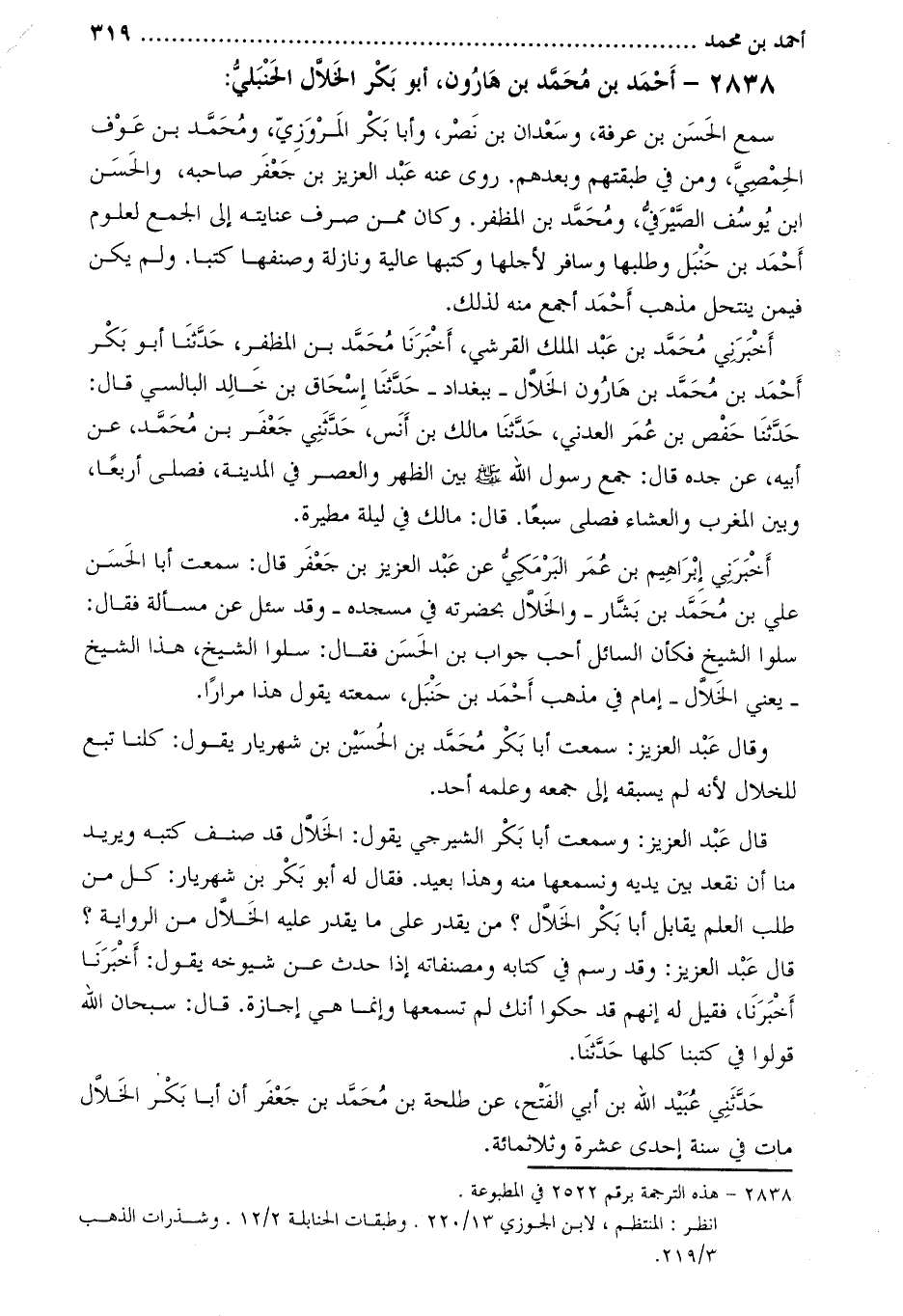 2838- أَحْمَد بْن مُحَمَّد بْن هارون، أَبُو بَكْر الخلال الحَنْبَلي [1] :