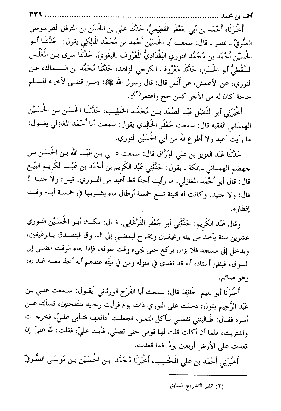 أخبرناه أحمد بن أبي جعفر القطيعيّ، حَدَّثَنَا عَلِيُّ بْنُ الْحَسَنِ بْنِ الْمترفقِ الطَّرَسُوسِيُّ الصُّوفِيُّ- بِمِصْرَ- قَالَ: سَمِعْتُ أَبَا الْحُسَيْنِ أَحْمَدَ بن محمّد المالكي يقول: حدّثنا أبو الحسين أَحْمَدُ بْنُ مُحَمَّدٍ النُّورِيُّ الْبَغْدَادِيُّ الْمَعْرُوفُ بِالْبَغَوِيِّ، حَدَّثَنَا سَرِيُّ بْنُ الْمُغَلِّسِ السَّقَطِيُّ أَبُو الْحَسَنِ، حدّثنا معروف الكرخي الزاهد، حَدَّثَنَا مُحَمَّدُ بْنُ السَّمَّاكِ، عَنِ الثَّوْرِيِّ، عَنِ الأَعْمَشِ، عَنْ أَنَسٍ قَالَ: قَالَ رَسُولُ اللَّهِ صَلَّى اللَّهُ عَلَيْهِ وَسَلَّمَ: «مَنْ قَضَى لأَخِيهِ الْمُسْلِمِ حَاجَةً كَانَ لَهُ مِنَ الأَجْرِ كَمَنْ حَجَّ وَاعْتَمَرَ [1] »