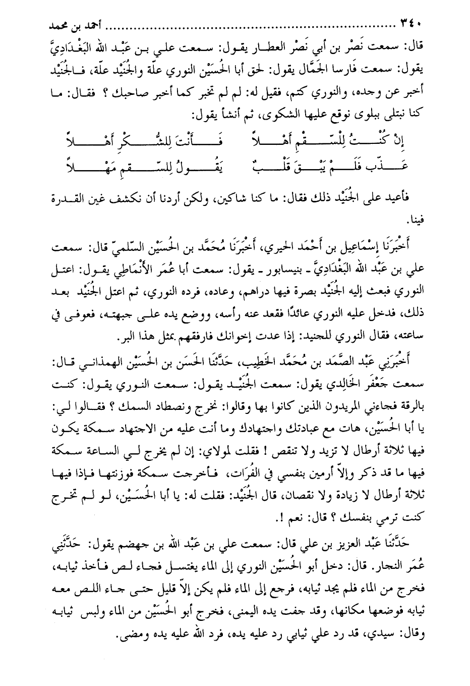 قَالَ: سمعت نصر بْن أَبِي نصر العطار يقول: سمعت عَلِيّ بْن عَبْد اللَّهِ البغدادي يقول: سمعت فارسا الجمال يقول: لحق أبا الحسين النوري علة وَالجنيد علة، فالجنيد أخبر عَن وجده، وَالنوري كتم، فقيل له: لم لم تخبر كما أخبر صاحبك؟ فَقَالَ: ما كنا نبتلي ببلوى نوقع عليها الشكوى، ثم أنشأ يقول: