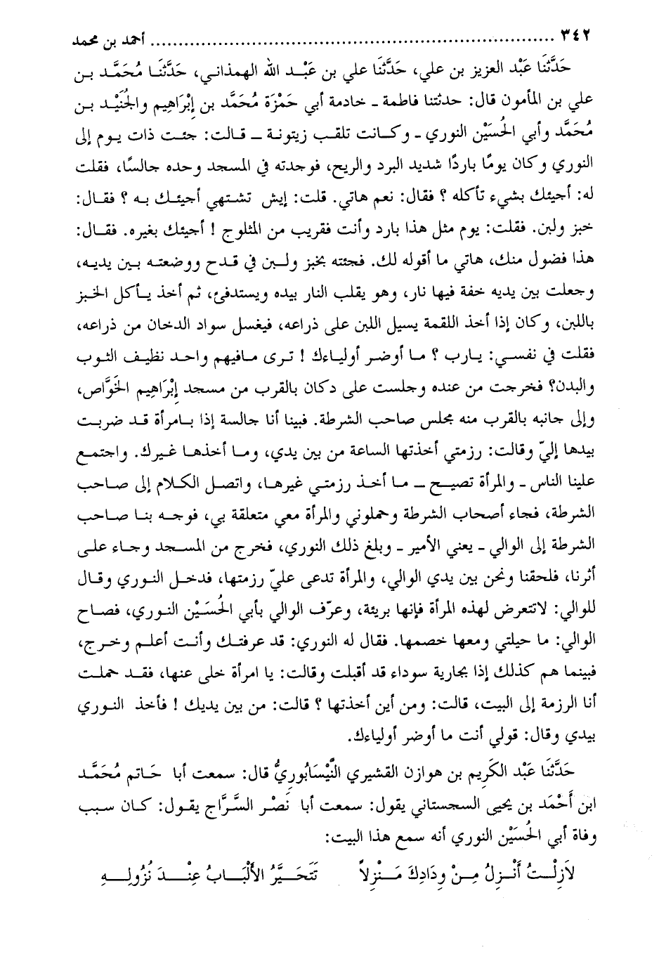 حَدَّثَنَا عَبْد الكريم بْن هوازن القشيري النيسابوري قَالَ: سمعت أبا حاتم محمّد ابن أَحْمَد بْن يَحْيَى السجستاني يَقُولُ: سَمِعْتُ أَبَا نصر السراج يقول: كَانَ سبب وفاة أَبِي الحسين النوري أنه سمع هذا البيت: