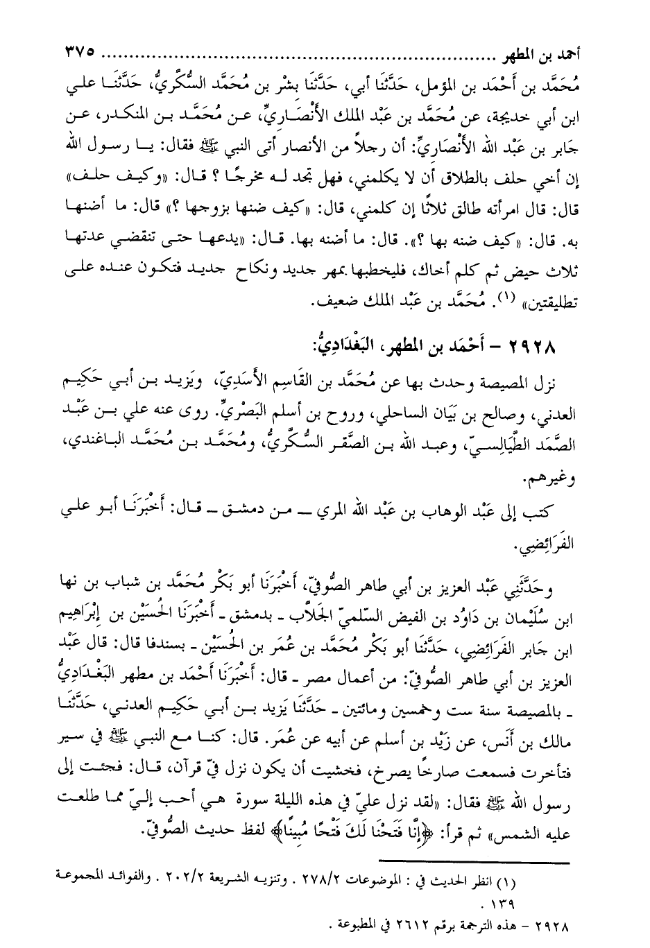 وحَدَّثَنِي عَبْد الْعَزِيزِ بْن أَبِي طَاهِر الصوفِي، أَخْبَرَنَا أَبُو بَكْرٍ مُحَمَّدُ بْنُ شَبَابِ بْنِ نهار ابن سلْيمَانَ بْنِ دَاوُدَ بْنِ الْفَيْضِ السُّلَمِيُّ الْجَلابُ- بدمشق- أخبرنا الحسين بن إبراهيم ابن جابر الفرائضي، حَدَّثَنَا أَبُو بَكْرٍ مُحَمَّدُ بْنُ عُمَرَ بْنِ الحسين- بسندفا قال: قال عبد العزيز بن أبي طاهر الصّوفيّ: مِنْ أَعْمَالِ مِصْرَ- قَالَ: أَخْبَرَنَا أَحْمَدُ بْنُ مطهر البغداديّ- بالمصيصة سنة ست وخمسين ومائتين- حدّثنا يزيد بن أبي حكيم العدني، حَدَّثَنَا مَالِكُ بْنُ أَنَسٍ، عَنْ زَيْدِ بْنِ أَسْلَمَ عَنْ أَبِيهِ عَنْ عُمَرَ. قَالَ: كُنَّا مَعَ النَّبِيِّ صَلَّى اللَّهُ عَلَيْهِ وَسَلَّمَ فِي سَيْرٍ فَتَأَخَّرْتُ فَسَمِعْتُ صَارِخًا يَصْرُخُ، فَخَشِيتُ أَنْ يَكُونَ نَزَلَ فِيَّ قُرْآنٌ، قَالَ: فَجِئْتُ إِلَى رَسُولِ اللَّهِ صَلَّى اللَّهُ عَلَيْهِ وَسَلَّمَ فَقَالَ: «لَقَدْ نَزَلَ عَلَيَّ فِي هَذِهِ اللَّيْلَةِ سُورَةٌ هِيَ أَحَبُّ إِلَيَّ مِمَّا طَلَعَتْ عَلَيْهِ الشَّمْسُ» ثُمَّ قَرَأَ: إِنَّا فَتَحْنا لَكَ فَتْحاً مُبِيناً
