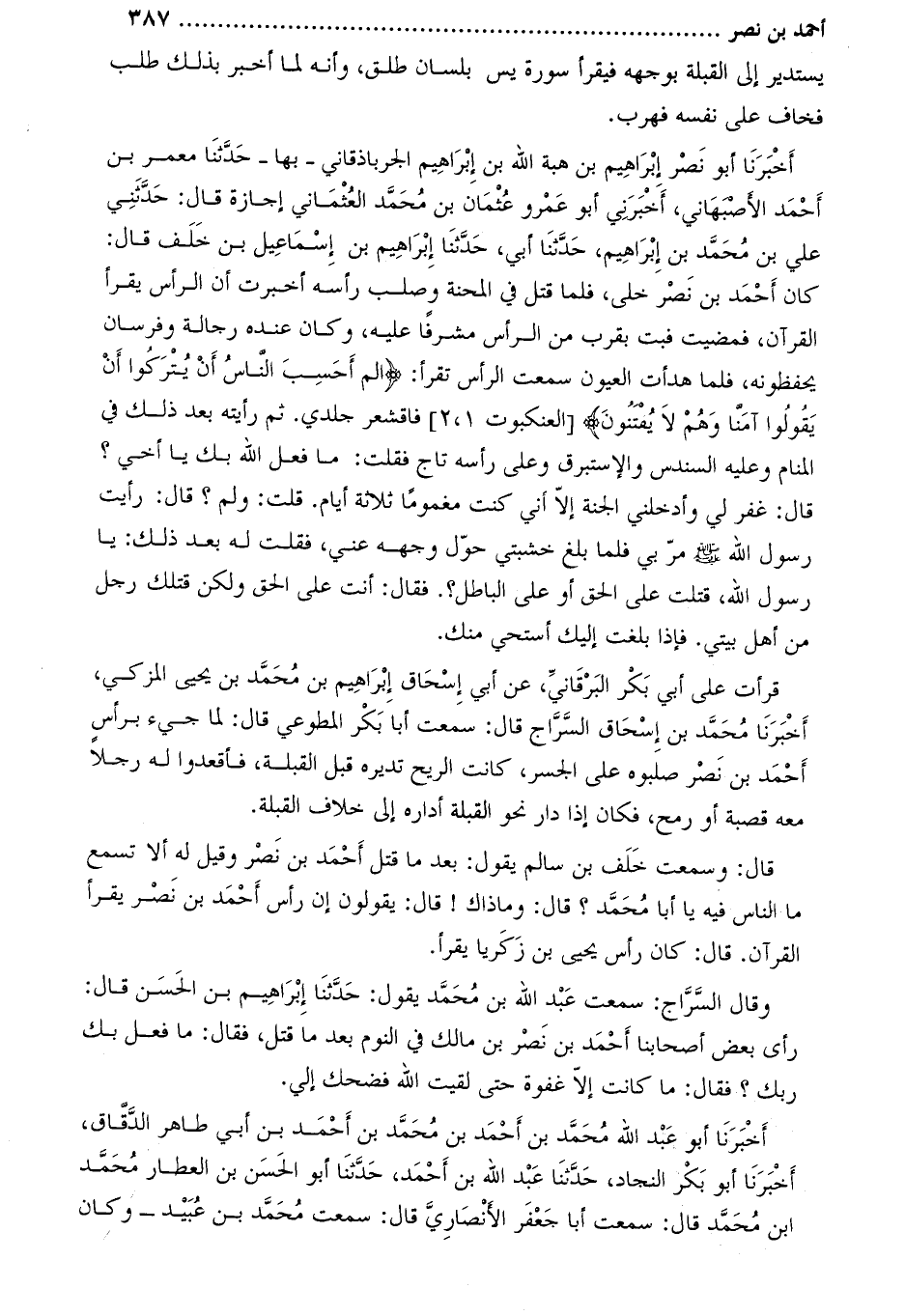 كَانَ أَحْمَد بْن نصر خلى، فلما قتل فِي المحنة وصلب رأسه أخبرت أن الرأس يقرأ القرآن، فمضيت فبت بقرب من الرأس مشرفا عَلَيْهِ، وكَانَ عنده رجالة وفرسان يحفظونه، فلما هدأت العيون سمعت الرأس تقرأ: الم أَحَسِبَ النَّاسُ أَنْ يُتْرَكُوا أَنْ يَقُولُوا آمَنَّا وَهُمْ لا يُفْتَنُونَ