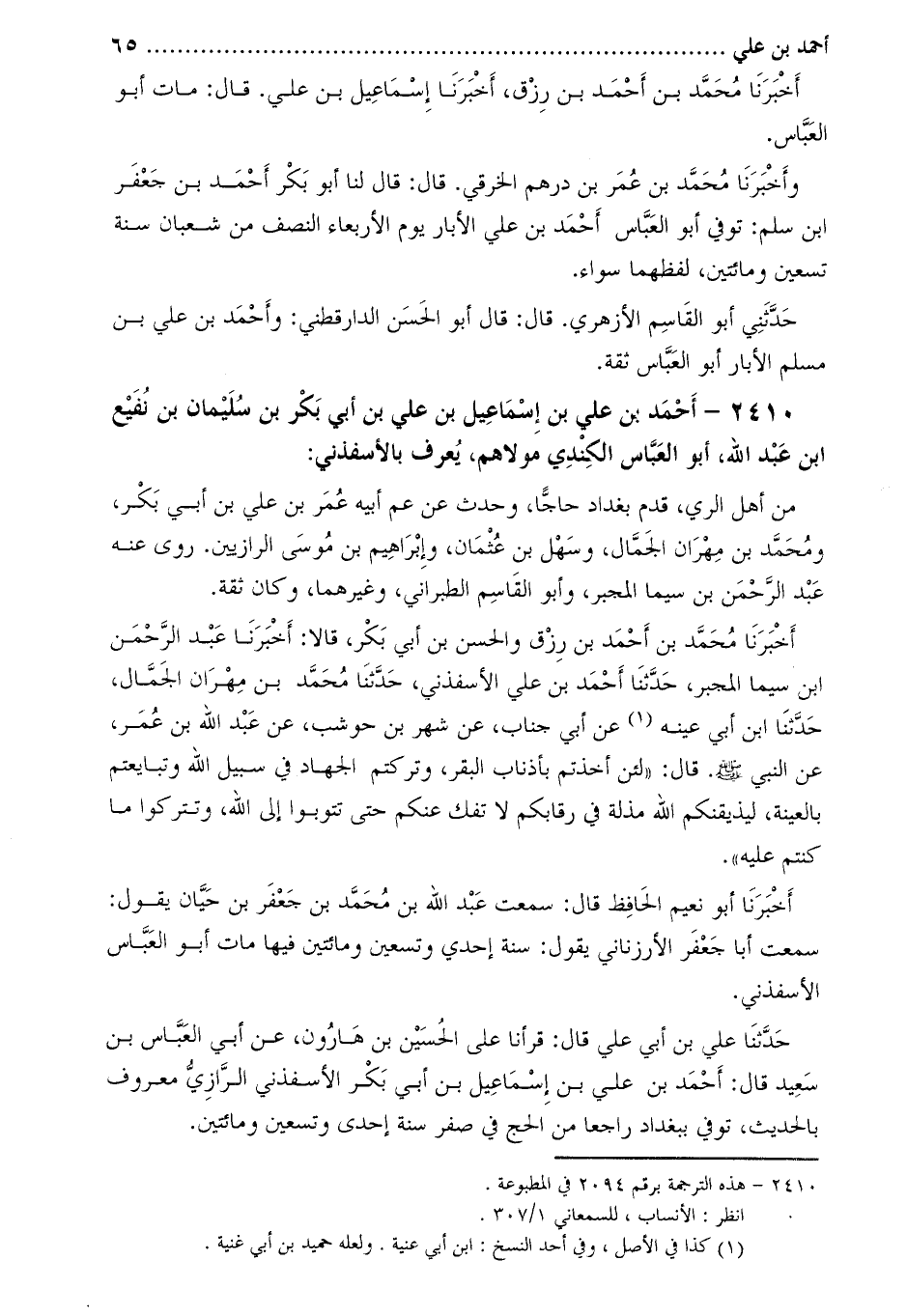 2410- أَحْمَد بْن عَلِيّ بْن إِسْمَاعِيل بْن عَلِيّ بْن أَبِي بَكْر بْن سُلَيْمَان بْن نفيع ابن عَبْد اللَّه، أَبُو الْعَبَّاس الكندي مولاهم، يعرف بالإسفذني [1] :