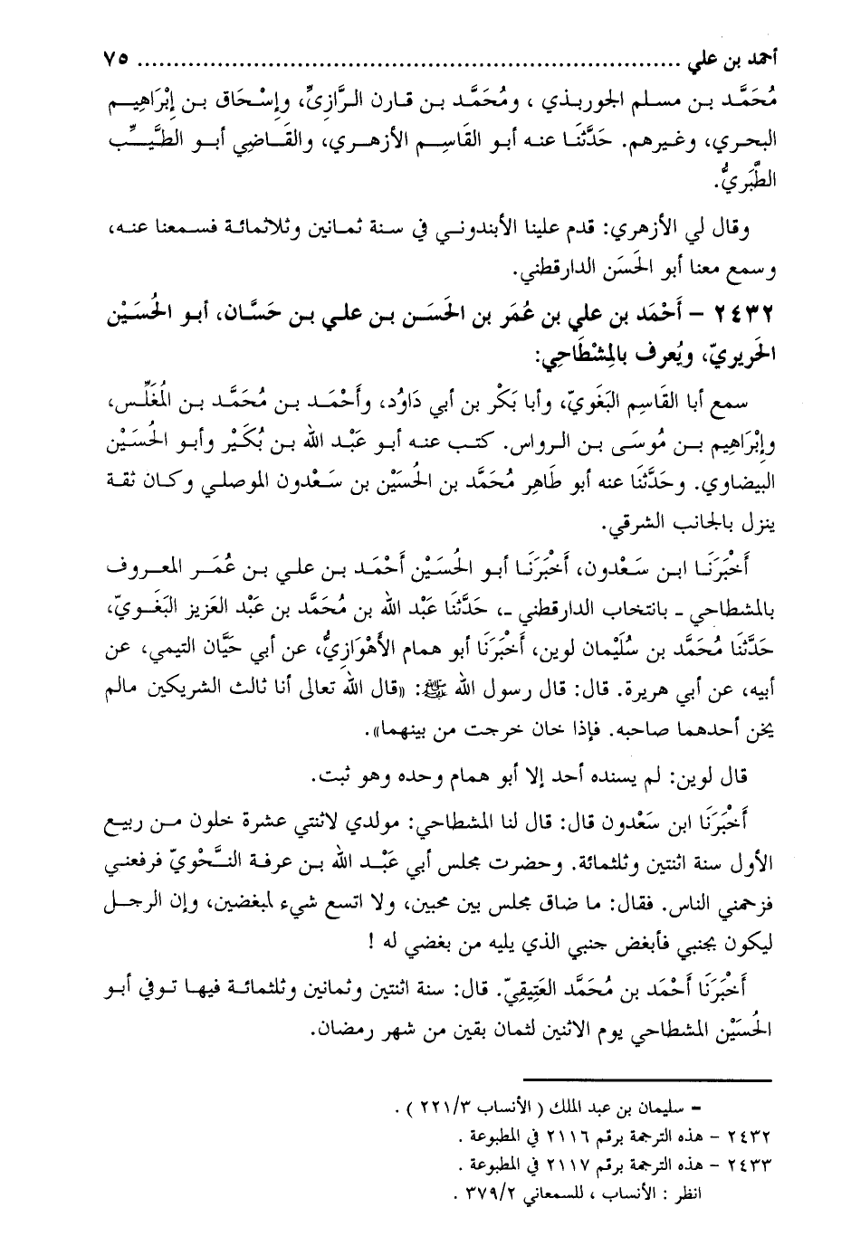 2432- أحمد بن علي بن عمر بن الْحَسَن بْن عَلِيّ بْن حسان، أَبُو الْحُسَيْن الحريري، ويعرف بالمشطاحي [1] :