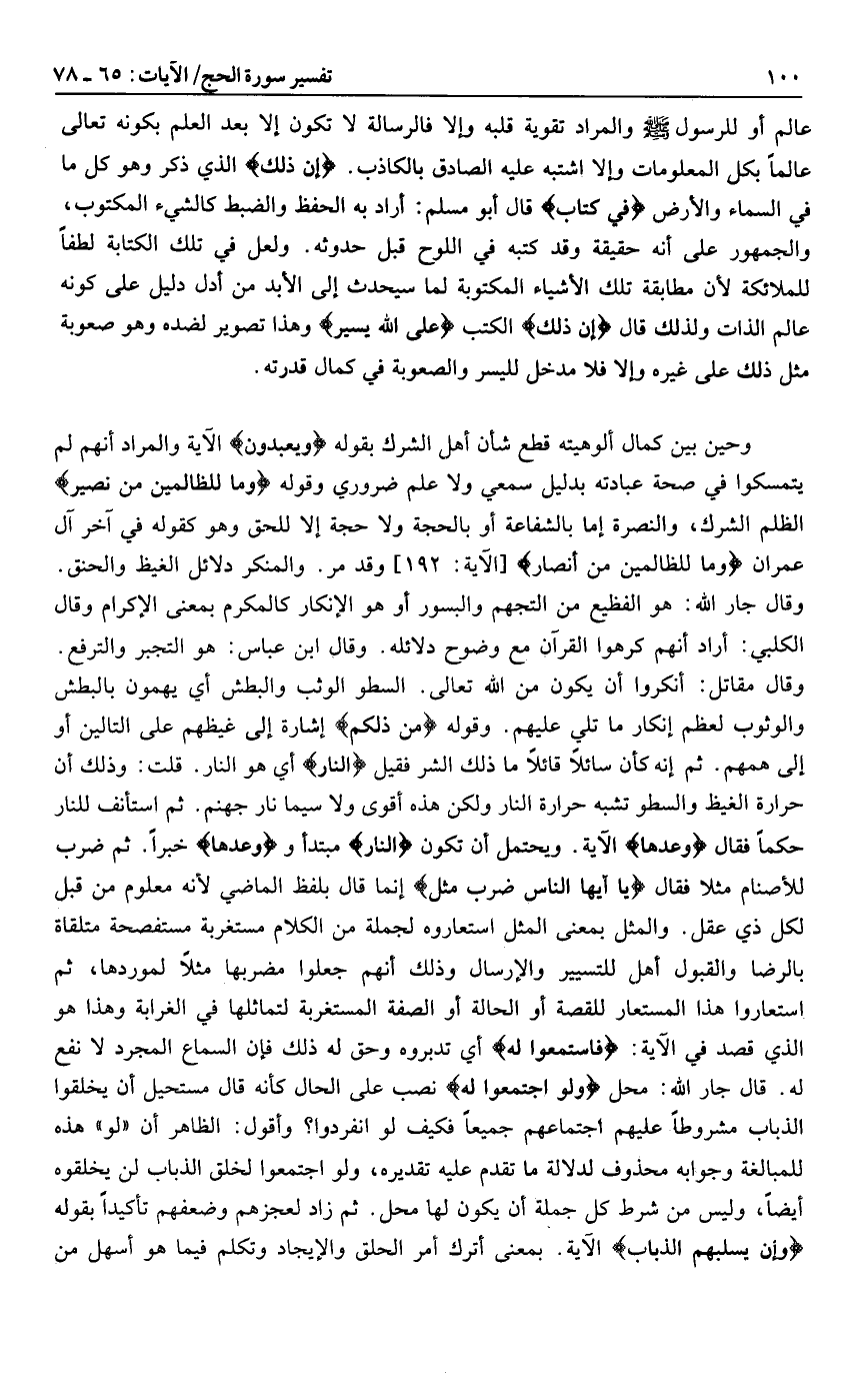 وقال مقاتل: أنكروا أن يكون من الله تعالى. السطو الوثب والبطش أي يهمون بالبطش والوثوب لعظم إنكار ما تلي عليهم. وقوله مِنْ ذلِكُمُ إشارة إلى غيظهم على التالين أو إلى همهم. ثم إنه كأن سائلا قائلا ما ذلك الشر فقيل النَّارُ أي هو النار. قلت: وذلك أن حرارة الغيظ والسطو تشبه حرارة النار ولكن هذه أقوى ولا سيما نار جهنم. ثم استأنف للنار حكما فقال وَعَدَهَا الآية. ويحتمل أن تكون النَّارُ مبتدأ ووَعَدَهَا خبرا. ثم ضرب للأصنام مثلا فقال يا أَيُّهَا النَّاسُ ضُرِبَ مَثَلٌ إنما قال بلفظ الماضي لأنه معلوم من قبل لكل ذي عقل. والمثل بمعنى المثل استعاروه لجملة من الكلام مستغربة مستفصحة متلقاة بالرضا والقبول أهل للتسيير والإرسال وذلك أنهم جعلوا مضربها مثلا لموردها، ثم استعاروا هذا المستعار للقصة أو الحالة أو الصفة المستغربة لتماثلها في الغرابة وهذا هو الذي قصد في الآية: فَاسْتَمِعُوا لَهُ أي تدبروه وحق له ذلك فإن السماع المجرد لا نفع له. قال جار الله: محل وَلَوِ اجْتَمَعُوا لَهُ نصب على الحال كأنه قال مستحيل أن يخلقوا الذباب مشروطا عليهم اجتماعهم جميعا فكيف لو انفردوا؟ وأقول: الظاهر أن «لو» هذه للمبالغة وجوابه محذوف لدلالة ما تقدم عليه تقديره، ولو اجتمعوا لخلق الذباب لن يخلقوه أيضا، وليس من شرط كل جملة أن يكون لها محل. ثم زاد لعجزهم وضعفهم تأكيدا بقوله وَإِنْ يَسْلُبْهُمُ الذُّبابُ الآية. بمعنى أترك أمر الحلق والإيجاد وتكلم فيما هو أسهل من