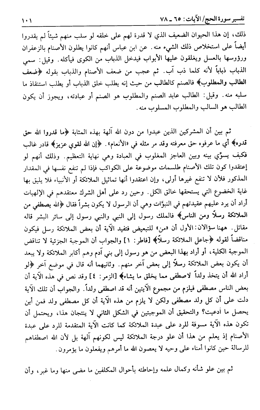 ثم بين أن المشركين الذين عبدوا من دون الله آلهة بهذه المثابة ما قَدَرُوا اللَّهَ حَقَّ قَدْرِهِ أي ما عرفوه حق معرفته وقد مر مثله في «الأنعام» . إِنَّ اللَّهَ لَقَوِيٌّ عَزِيزٌ قادر غالب فكيف يسوّي بينه وبين العاجز المغلوب في العبادة وهي نهاية التعظيم. وذلك أنهم لو اعتقدوا كون تلك الأصنام طلسمات موضوعة على الكواكب فإذا لم تنفع نفسها في المقدار المذكور فلأن لا تنفع غيرها أولى، وإن اعتقدوا أنها تماثيل الملائكة أو الأنبياء فلا يليق بها غاية الخضوع التي يستحقها خالق الكل. وحين رد على أهل الشرك معتقدهم في الإلهيات أراد أن يرد عليهم عقيدتهم في النبوّات وهي أن الرسول لا يكون بشرا فقال اللَّهُ يَصْطَفِي مِنَ الْمَلائِكَةِ رُسُلًا وَمِنَ النَّاسِ فالملك رسول إلى النبي والنبي رسول إلى سائر البشر قاله مقاتل. هاهنا سؤالان: الأول أن «من» للتبعيض فتفيد الآية أن بعض الملائكة رسل فيكون مناقضا لقوله جاعِلِ الْمَلائِكَةِ رُسُلًا [فاطر: 1] والجواب أن الموجبة الجزئية لا تناقض الموجبة الكلية، أو أراد بهذا البعض من هو رسول إلى بني آدم وهم أكابر الملائكة ولا يبعد أن يكون بعض الملائكة رسلا إلى بعض آخر منهم. وثانيهما أنه قال في موضع آخر لَوْ أَرادَ اللَّهُ أَنْ يَتَّخِذَ وَلَداً لَاصْطَفى مِمَّا يَخْلُقُ ما يَشاءُ [الزمر: 4] وقد نص في هذه الآية أن بعض الناس مصطفى فيلزم من مجموع الآيتين أنه قد اصطفى ولدا. والجواب أن تلك الآية دلت على أن كل ولد مصطفى ولكن لا يلزم من هذه الآية أن كل مصطفى ولد فمن أين يحصل ما ادعيت؟ والتحقيق أن الموجبتين في الشكل الثاني لا ينتجان هذا، ويحتمل أن تكون هذه الآية مسوقة للرد على عبدة الملائكة كما كانت الآية المتقدمة للرد على عبدة الأصنام إذ يعلم من هذا أن علو درجة الملائكة ليس لكونهم آلهة بل لأن الله اصطفاهم للرسالة حين كانوا أمناء على وحيه لا يعصون الله ما أمرهم ويفعلون ما يؤمرون.