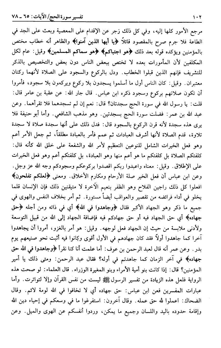 وعن ابن عباس أن فعل الخير صلة الأرحام ومكارم الأخلاق. ومعنى لَعَلَّكُمْ تُفْلِحُونَ افعلوا كل ذلك راجين الفلاح وهو الظفر بنعيم الآخرة لا متيقنين ذلك فإن الإنسان قلما يخلو في أداء فرائضه من تقصير والعواقب أيضا مستورة. ثم أمره بخلاف النفس والهوى في جميع ما ذكر وهو الجهاد الأكبر فقال وَجاهِدُوا فِي اللَّهِ أي في ذاته ومن أجله حَقَّ جِهادِهِ أي حق الجهاد فيه أو حق جهادكم فيه فإضافة الجهاد إلى الله من قبيل التوسعة ولأدنى ملابسة من حيث إن الجهاد فعل لوجهه. وقيل: هو أمر بالغزو، أمروا أن يجاهدوا آخرا كما جاهدوا أولا فقد كان جهادهم في الأول أقوى وكانوا فيه أثبت نحو صنيعهم يوم بدر. وعن عمر أنه قال لعبد الرحمن بن عوف: أما علمت أنا كنا نقرأ وَجاهِدُوا فِي اللَّهِ حَقَّ جِهادِهِ في آخر الزمان كما جاهدتم في أوله؟ فقال عبد الرحمن: ومتى ذلك يا أمير المؤمنين؟ قال: إذا كانت بنو أمية الأمراء وبنو المغيرة الوزراء. قال العلماء: لو صحت هذه الرواية فلعل هذه الزيادة من تفسير الرسول صلى الله عليه وسلم ليست من نفس القرآن وإلا لتواترت. وأما عبارات المفسرين فعن ابن عباس: حق جهاده أي لا تخافوا في الله لومة لائم. وقال الضحاك: اعملوا لله حق عمله. وقال آخرون: استفرغوا ما في وسعكم في إحياء دين الله وإقامة حدوده باليد واللسان وجميع ما يمكن، وردوا أنفسكم عن الهوى والميل. وعن