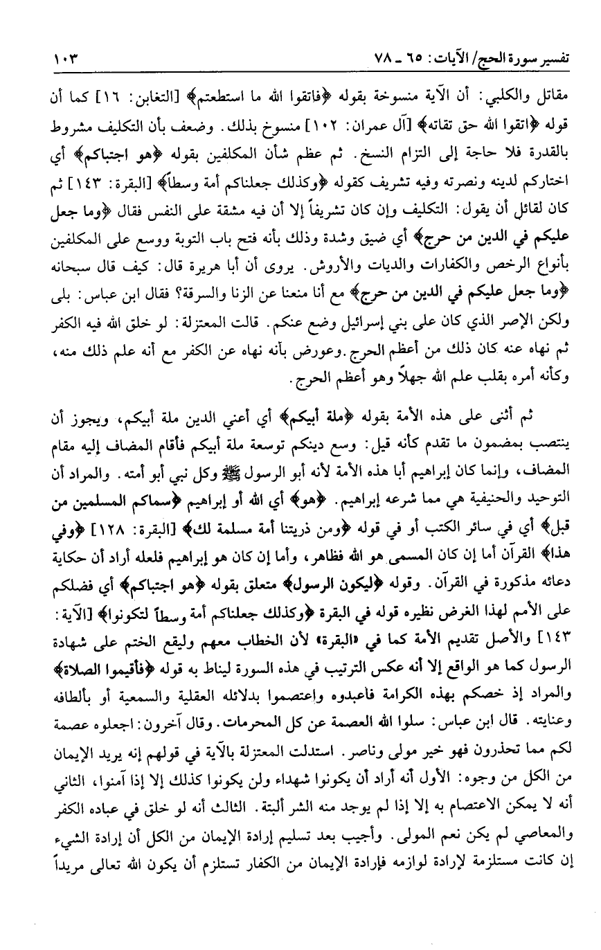 ثم أثنى على هذه الأمة بقوله مِلَّةَ أَبِيكُمْ أي أعني الدين ملة أبيكم، ويجوز أن ينتصب بمضمون ما تقدم كأنه قيل: وسع دينكم توسعة ملة أبيكم فأقام المضاف إليه مقام المضاف، وإنما كان إبراهيم أبا هذه الأمة لأنه أبو الرسول صلى الله عليه وسلم وكل نبي أبو أمته. والمراد أن التوحيد والحنيفية هي مما شرعه إبراهيم. هُوَ أي الله أو إبراهيم سَمَّاكُمُ الْمُسْلِمِينَ مِنْ قَبْلُ أي في سائر الكتب أو في قوله وَمِنْ ذُرِّيَّتِنا أُمَّةً مُسْلِمَةً لَكَ [البقرة: 128] وَفِي هذا القرآن أما إن كان المسمى هو الله فظاهر، وأما إن كان هو إبراهيم فلعله أراد أن حكاية دعائه مذكورة في القرآن. وقوله لِيَكُونَ الرَّسُولُ متعلق بقوله هُوَ اجْتَباكُمْ أي فضلكم على الأمم لهذا الغرض نظيره قوله في البقرة وَكَذلِكَ جَعَلْناكُمْ أُمَّةً وَسَطاً لِتَكُونُوا [الآية: