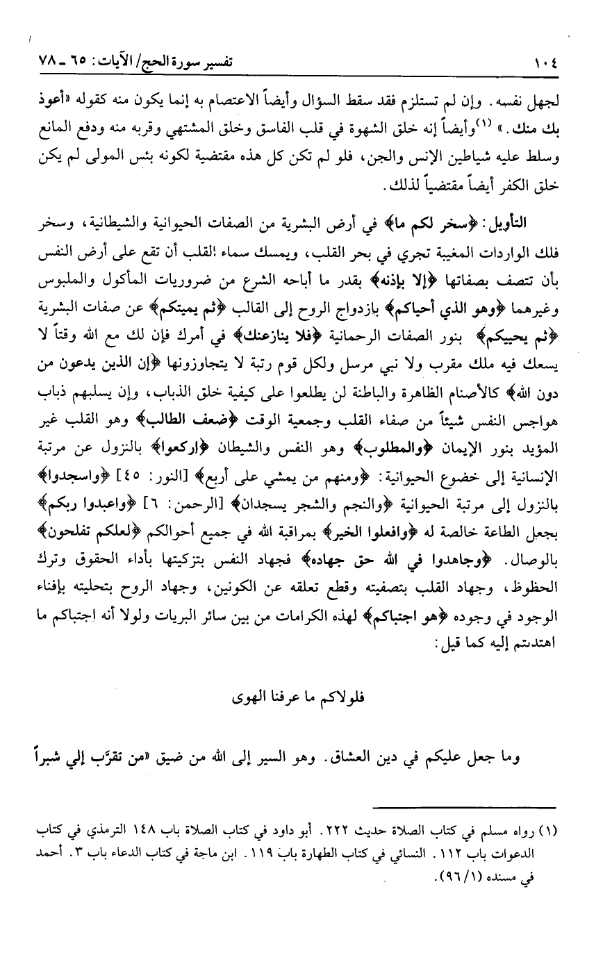 سَخَّرَ لَكُمْ ما في أرض البشرية من الصفات الحيوانية والشيطانية، وسخر فلك الواردات المغيبة تجري في بحر القلب، ويمسك سماء القلب أن تقع على أرض النفس بأن تتصف بصفاتها إِلَّا بِإِذْنِهِ بقدر ما أباحه الشرع من ضروريات المأكول والملبوس وغيرهما وَهُوَ الَّذِي أَحْياكُمْ بازدواج الروح إلى القالب ثُمَّ يُمِيتُكُمْ عن صفات البشرية ثُمَّ يُحْيِيكُمْ بنور الصفات الرحمانية فَلا يُنازِعُنَّكَ في أمرك فإن لك مع الله وقتا لا يسعك فيه ملك مقرب ولا نبي مرسل ولكل قوم رتبة لا يتجاوزونها إن الذين يدعون من دون الله كالأصنام الظاهرة والباطنة لن يطلعوا على كيفية خلق الذباب، وإن يسلبهم ذباب هواجس النفس شيئا من صفاء القلب وجمعية الوقت ضَعُفَ الطَّالِبُ وهو القلب غير المؤيد بنور الإيمان وَالْمَطْلُوبُ وهو النفس والشيطان ارْكَعُوا بالنزول عن مرتبة الإنسانية إلى خضوع الحيوانية: وَمِنْهُمْ مَنْ يَمْشِي عَلى أَرْبَعٍ [النور: 45] وَاسْجُدُوا بالنزول إلى مرتبة الحيوانية وَالنَّجْمُ وَالشَّجَرُ يَسْجُدانِ [الرحمن: 6] وَاعْبُدُوا رَبَّكُمْ بجعل الطاعة خالصة له وَافْعَلُوا الْخَيْرَ بمراقبة الله في جميع أحوالكم لَعَلَّكُمْ تُفْلِحُونَ بالوصال. وَجاهِدُوا فِي اللَّهِ حَقَّ جِهادِهِ فجهاد النفس بتزكيتها بأداء الحقوق وترك الحظوظ، وجهاد القلب بتصفيته وقطع تعلقه عن الكونين، وجهاد الروح بتحليته بإفناء الوجود في وجوده هُوَ اجْتَباكُمْ لهذه الكرامات من بين سائر البريات ولولا أنه اجتباكم ما اهتديتم إليه كما قيل: