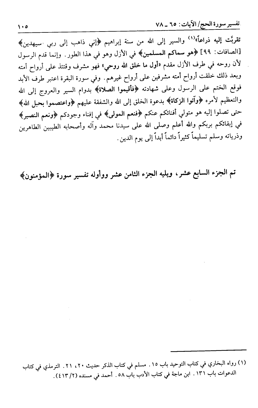 تم الجزء السابع عشر، ويليه الجزء الثامن عشر وأوله تفسير سورة المؤمنون