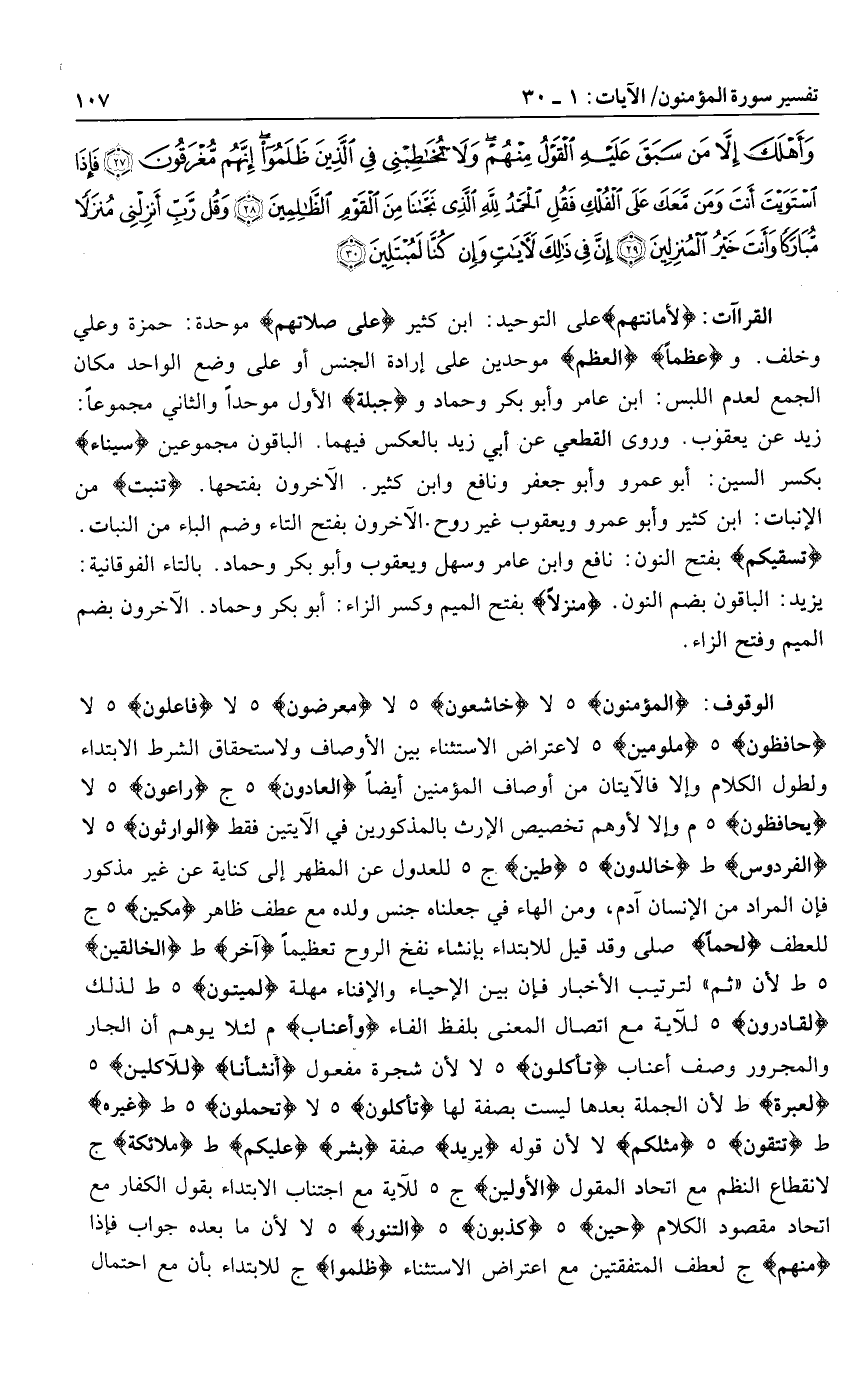 الْمُؤْمِنُونَ هـ لا خاشِعُونَ هـ لا مُعْرِضُونَ هـ لا فاعِلُونَ هـ لا حافِظُونَ هـ مَلُومِينَ هـ لاعتراض الاستثناء بين الأوصاف ولاستحقاق الشرط الابتداء ولطول الكلام وإلا فالآيتان من أوصاف المؤمنين أيضا العادُونَ هـ ج راعُونَ هـ لا يُحافِظُونَ هـ وإلا لأوهم تخصيص الإرث بالمذكورين في الآيتين فقط الْوارِثُونَ هـ لا الْفِرْدَوْسَ ط خالِدُونَ هـ طِينٍ ج هـ للعدول عن المظهر إلى كناية عن غير مذكور فإن المراد من الإنسان آدم، ومن الهاء في جعلناه جنس ولده مع عطف ظاهر مَكِينٍ هـ ج للعطف لَحْماً صلى وقد قيل للابتداء بإنشاء نفخ الروح تعظيما آخَرَ ط الْخالِقِينَ هـ ط لأن «ثم» لترتيب الأخبار فإن بين الإحياء والإفناء مهلة لَمَيِّتُونَ هـ ط لذلك لَقادِرُونَ هـ للآية مع اتصال المعنى بلفظ الفاء وَأَعْنابٍ لئلا يوهم أن الجار والمجرور وصف أعناب تَأْكُلُونَ هـ لا لأن شجرة مفعول فَأَنْشَأْنا لِلْآكِلِينَ هـ لَعِبْرَةً ط لأن الجملة بعدها ليست بصفة لها تَأْكُلُونَ هـ لاحْمَلُونَ