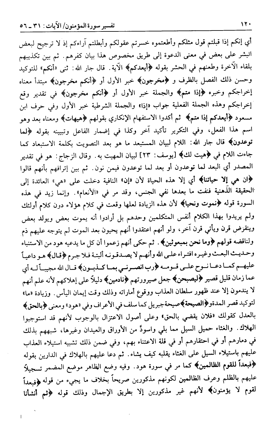أي إنكم إذا قبلتم قول مثلكم وأطعتموه خسرتم عقولكم وأبطلتم آراءكم إذ لا ترجيح لبعض البشر على بعض في معنى الدعوة إلى طريق مخصوص هذا بيان كفرهم. ثم بين تكذيبهم بلقاء الآخرة وطعنهم في الحشر بقوله أَيَعِدُكُمْ الآية. قال جار الله: ثني «أنكم» للتوكيد وحسن ذلك الفصل بالظرف ومُخْرَجُونَ خبر الأول أو أَنَّكُمْ مُخْرَجُونَ مبتدأ معناه إخراجكم وخبره إِذا مِتُّمْ والجملة خبر الأول أو أَنَّكُمْ مُخْرَجُونَ في تقدير وقع إخراجكم وهذه الجملة الفعلية جواب «إذا» والجملة الشرطية خبر الأول وفي حرف ابن مسعود أَيَعِدُكُمْ أَنَّكُمْ إِذا مِتُّمْ ثم أكدوا الاستفهام الإنكاري بقولهم هَيْهاتَ ومعناه بعد وهو اسم هذا الفعل، وفي التكرير تأكيد آخر وكذا في إضمار الفاعل وتبيينه بقوله لِما تُوعَدُونَ قال جار الله: اللام لبيان المستبعد ما هو بعد التصويت بكلمة الاستبعاد كما جاءت اللام في هَيْتَ لَكَ [يوسف: 23] لبيان المهيت به. وقال الزجاج: هو في تقدير المصدر أي البعد لما توعدون أو بعد لما توعدون فيمن نون. ثم بين إترافهم بأنهم قالوا إِنْ هِيَ إِلَّا حَياتُنَا أي إلا هذه الحياة لأن «إن» النافية دخلت على «هي» العائدة إلى الحقيقة الذهنية فنفت ما بعدها نفي الجنس، وقد مر في «الأنعام» . وإنما زيد في هذه السورة قوله نَمُوتُ وَنَحْيا لأن هذه الزيادة لعلها وقعت في كلام هؤلاء دون كلام أولئك ولم يريدوا بهذا الكلام أنفس المتكلمين وحدهم بل أرادوا أنه يموت بعض ويولد بعض وينقرض قرن ويأتي قرن آخر، ولو أنهم اعتقدوا أنهم يحيون بعد الموت لم يتوجه عليهم ذم ولناقضه قولهم وَما نَحْنُ بِمَبْعُوثِينَ. ثم حكى أنهم زعموا أن كل ما يدعيه هود من الاستنباء وحديث البعث وغيره افتراء على الله وأنهم لا يصدقونه البتة فلا جرم قالَ هو داعيا عليهم كما دعا نوح على قومه رَبِّ انْصُرْنِي بِما كَذَّبُونِ قال الله مجيبا له أي عما زمان قليل قصير لَيُصْبِحُنَّ جعل صيرورتهم نادِمِينَ دليلا على إهلاكهم لأنه علم أنهم لا يندمون إلا عند ظهور سلطان العذاب ووقوع أماراته وذلك وقت إيمان اليأس. وزيادة «ما» لتوكيد قصر المدة والصَّيْحَةُ صيحة جبريل كما سلف في الأعراف وفي «هود» ومعنى بِالْحَقِّ بالعدل كقولك «فلان يقضي بالحق» وعلى أصول الاعتزال بالوجوب لأنهم قد استوجبوا الهلاك. والغثاء حميل السيل مما بلي واسودّ من الأوراق والعيدان وغيرها، شبههم بذلك في دمارهم أو في احتقارهم أو في قلة الاعتناء بهم، وفي ضمن ذلك تشبيه استيلاء العذاب عليهم باستيلاء